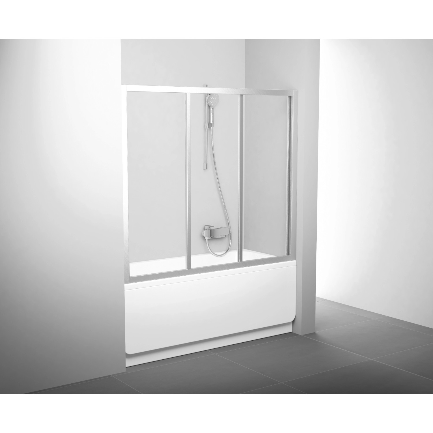 Háromelemes tolórendszerű kádparaván, mely egy fix és két mozgatható elemből áll. A kádparaván az egyenes felső peremű téglalap alakú kádakhoz alkalmazható.