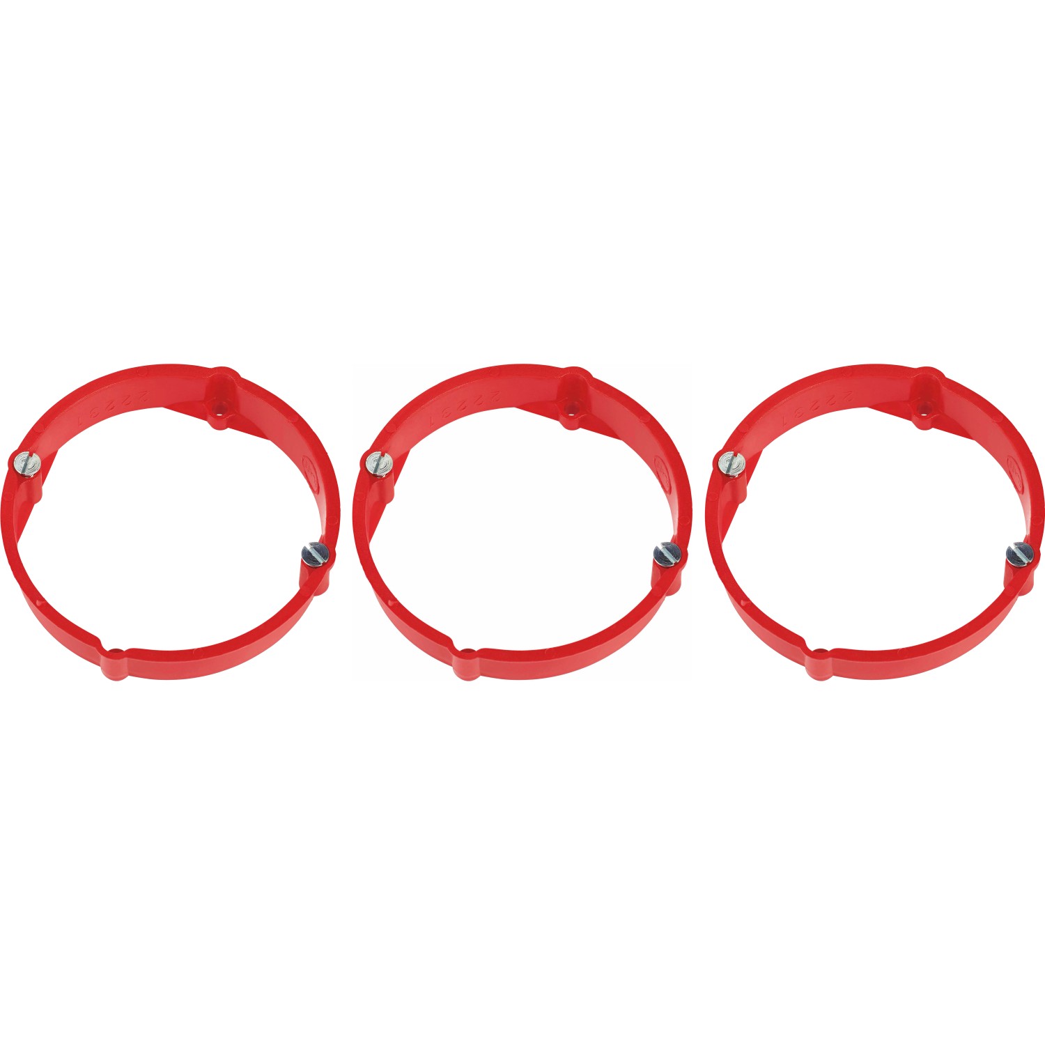 A piros vakolat-kiegyenlítő gyűrűk mindenfajta túl mélyen ülő készülékdoboz kiegyenlítésére használhatók. átmérő: 60 mm átmérőjűek és 12 mm mélyek. A három mellékelt készülékcsavar megkönnyíti a gyűrűk elhelyezését süllyesztett szerelésnél. A csomagba három darab tartozik.