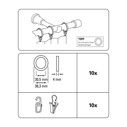 A Gardinia Europa fém függönykarikák a 19 mm átmérőjű Europa függönyrúdhoz alkalmasak, és minden megfelelő színben kaphatók. A csomag tartalmazza a megfelelő kapcsokat és ráncszedőket is. A gyűrűk belső átmérője 30,5 mm, külső átmérője 38,3 mm. A gyűrűk szélessége 4 mm.
