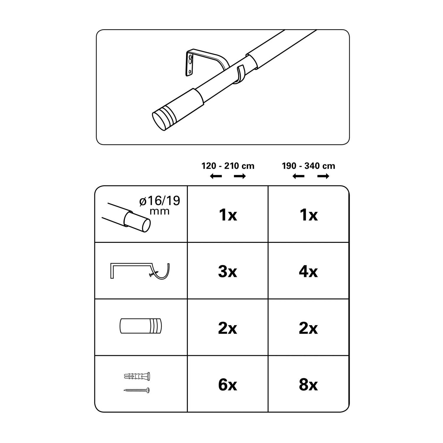 A fémből készült Gardinia komplett karnisgarnitúra tartalmazza a végzárókat, tartókonzolokat és függönykarikákat is. A függönyrúd 190 cm és 340 cm között kihúzható. Rozsdamentes acél hatású kivitelezése és hengeres formája miatt a készlet modern stílusú, egyidejűleg otthonos légkört is teremt.