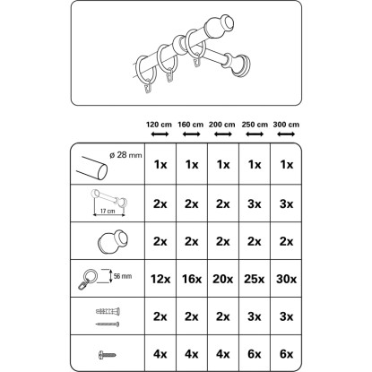 A fából készült, klasszikus Gardinia Lugano teljes stílusos karnisgarnitúra különböző hosszúságú és színű kivitelekben kapható. A készlet 1 darab 28 mm átmérőjű rúdból, 2 dekoratív végzáróból és a megfelelő tartókonzolokból áll. A csomagot ráncszedő akasztós függönykarikák teszik teljessé.