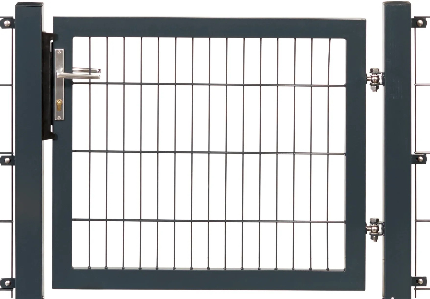 A kiváló minőségű Premium egyszárnyú kerítéskaput 80 mm x 80 mm méretű négyszögletes oszlopokkal és 200 mm x 50 mm méretű kétrudas rácskitöltéssel szállítjuk. Valamennyi esetben teljes kaput kínálunk két kapuoszloppal, kilincskészlettel, zárral és kulccsal. Felülete horganyzott, így biztosan ellenáll a rozsdának.