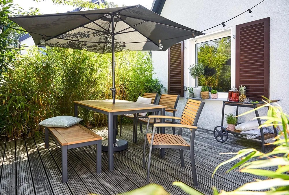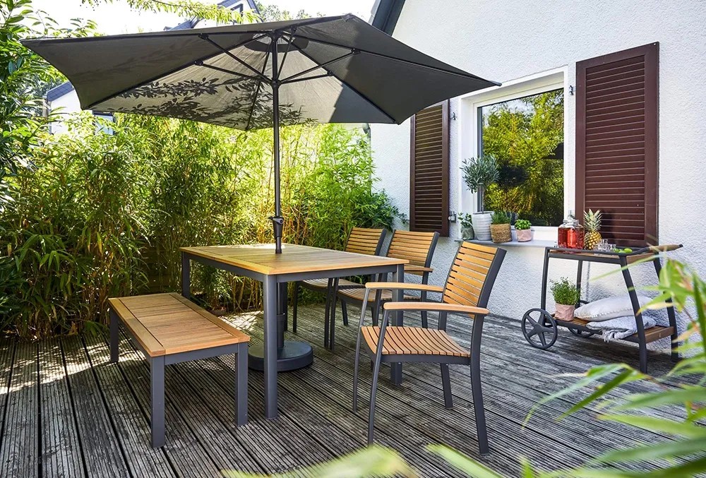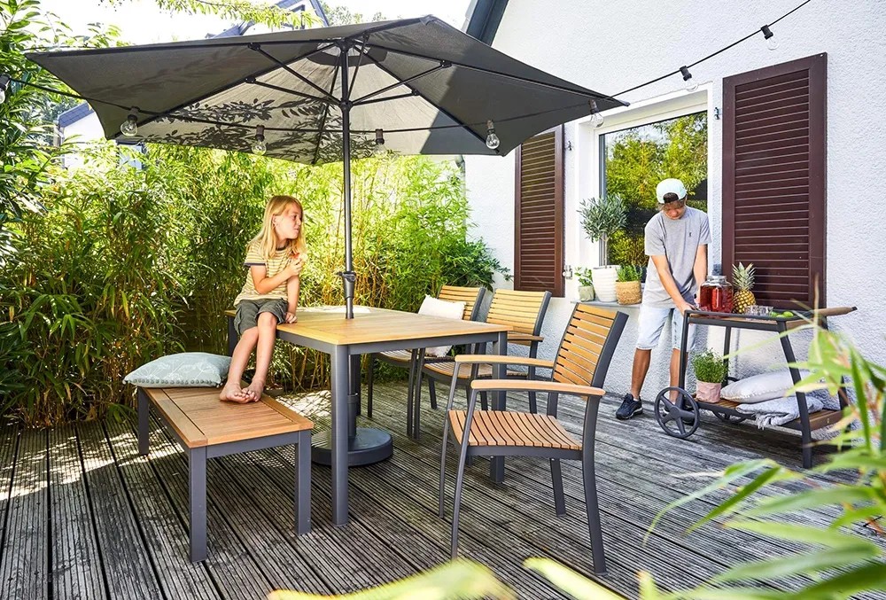 A hosszabbítás közepén egy praktikus nyílás található a napernyő számára. Így kényelmesen üldögélhet vendégeivel az asztalnál, és közben megfelelően védheti magát a nap erős sugaraitól.