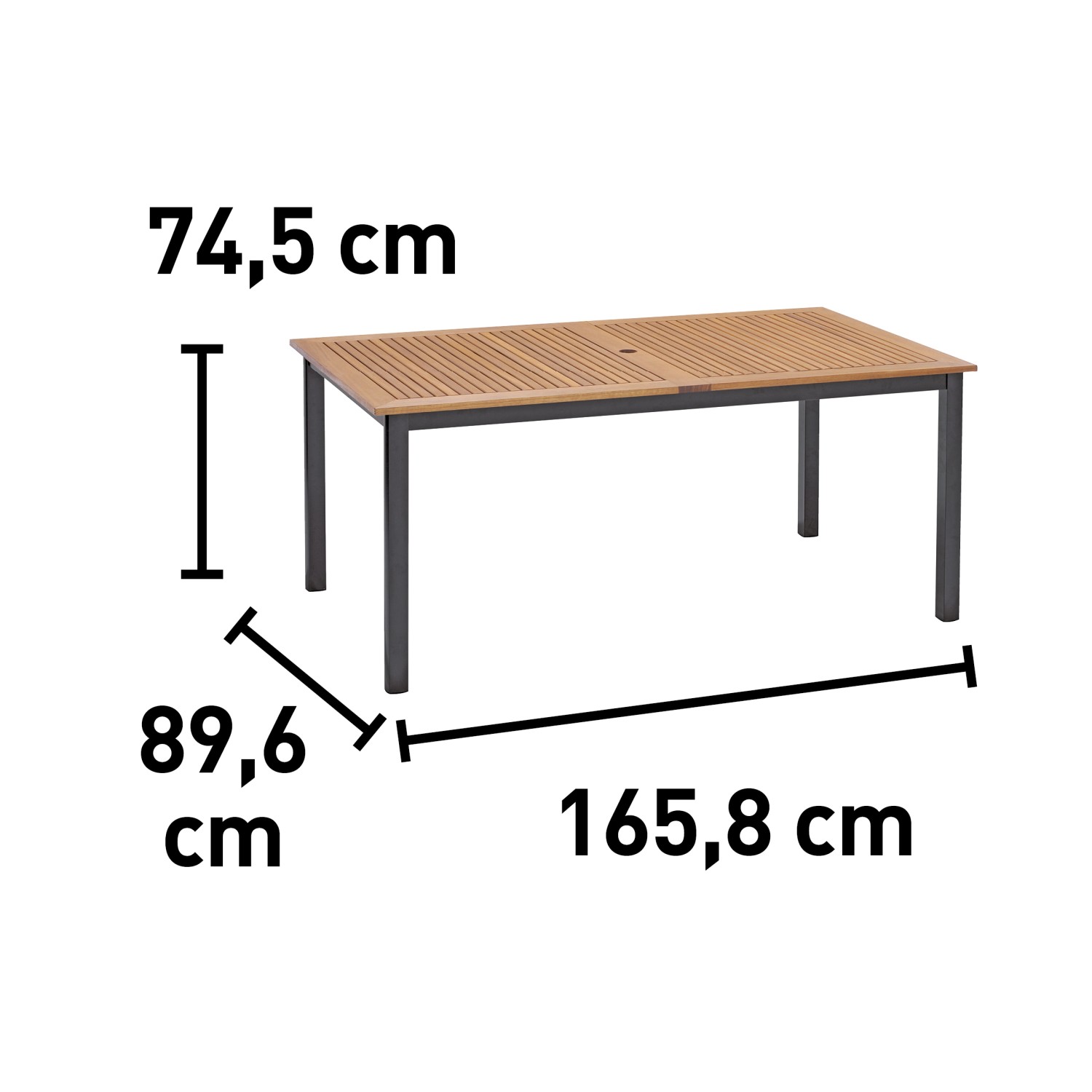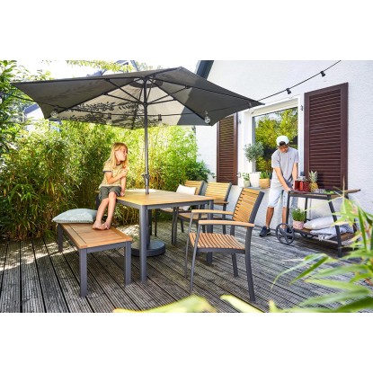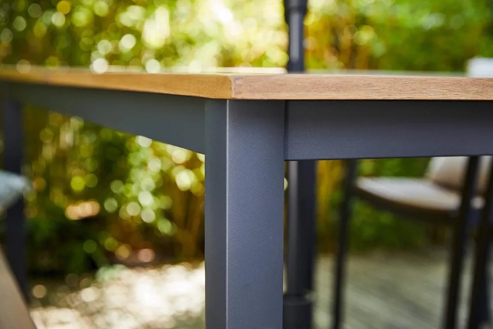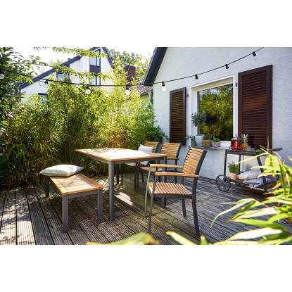 A váz könnyen kezelhető és stabil alumíniumból készült. Ezáltal az asztal könnyű, így jól mozgatható. Az asztallap értékes FSC®-tanúsítással rendelkező kemény eukaliptusz fából készült, így időjárásálló.
