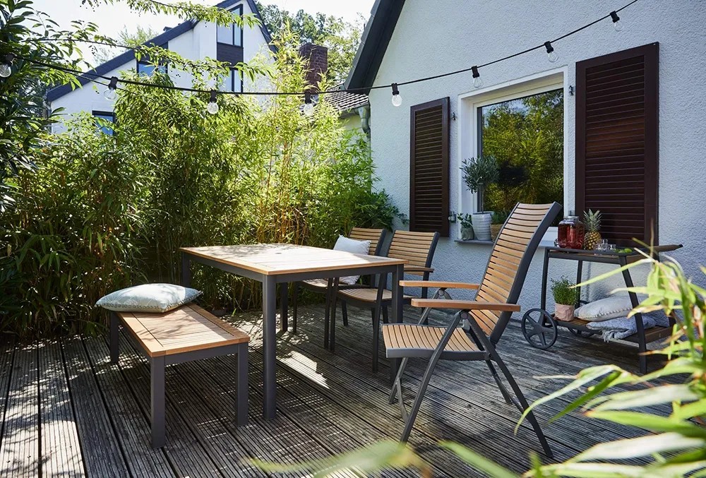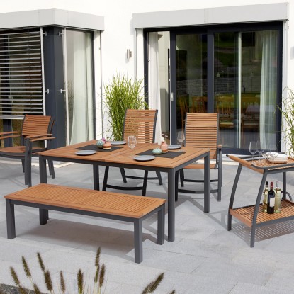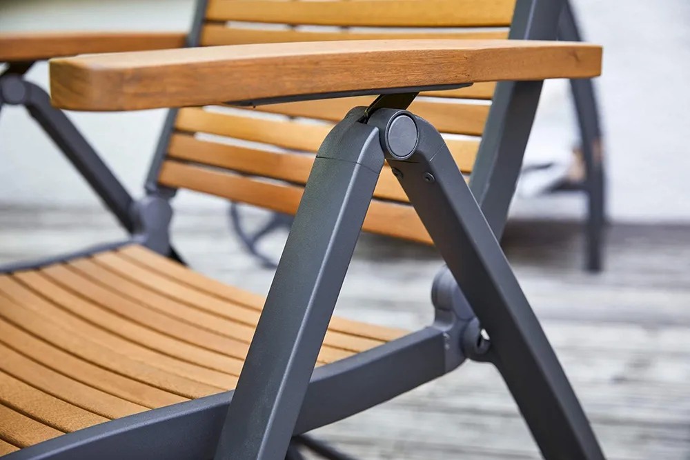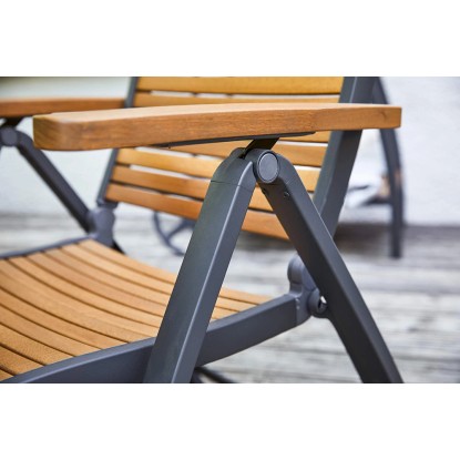 Az antracit színű alumínium és a meleg, világosbarna fa kombinációja rendkívül modern hatást kelt. Ez az anyagkombináció hamar magára vonzza a tekintetet a kertben. Az összecsukható szék ideálisan kombinálható a Bonlee sorozat többi kerti bútorával a harmonikus összkép kialakítása érdekében.