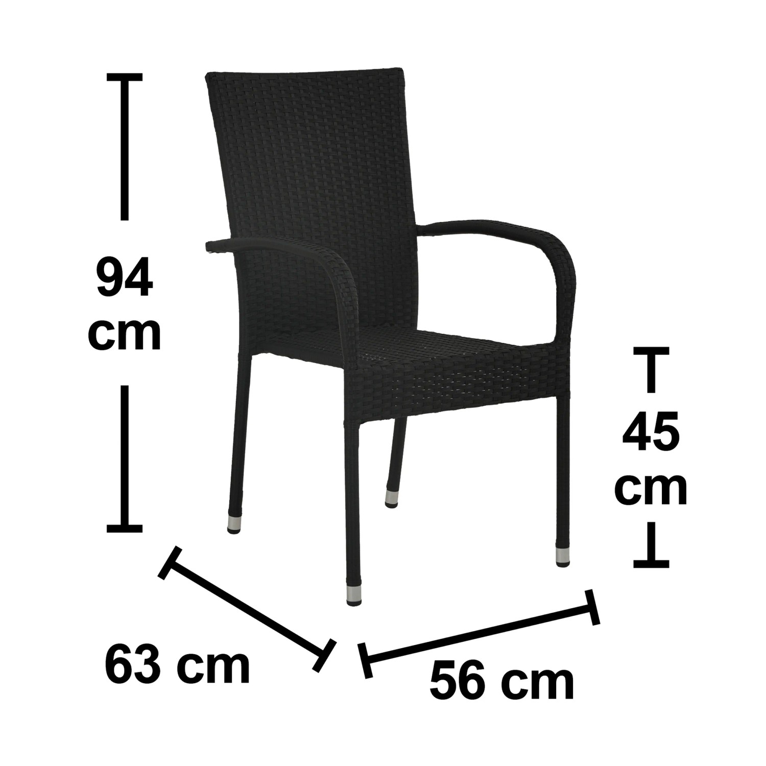 A Soncor egymásba rakható szék a stílusos megjelenést ötvözi a praktikus funkcionalitással. 44 cm x 44 cm-es ülőfelületével és 39 cm-es ülésmagasságával nagyfokú kényelmet biztosít, amelyet 43 cm magas háttámla egészít ki. A kézzel szőtt, elegáns fekete polirattan modern megjelenést kölcsönöz a széknek, ugyanakkor időjárásálló és könnyen tisztítható. Porszórt acélvázának köszönhetően a szék akár 110 kg terhelést is kibír, valamint stabilitást és tartósságot garantál - tökéletes a kertbe, a teraszra vagy az erkélyre.