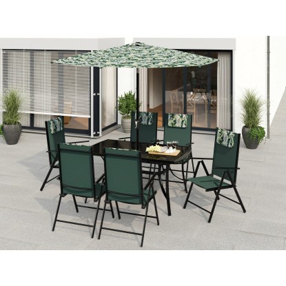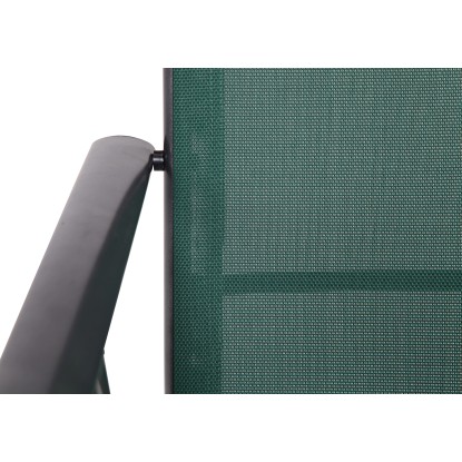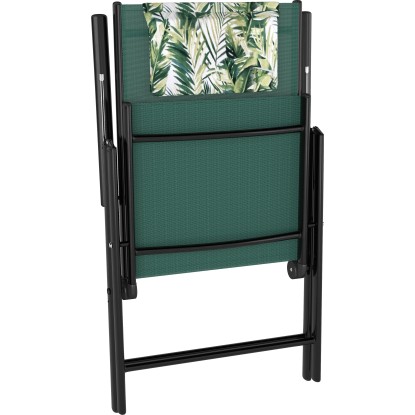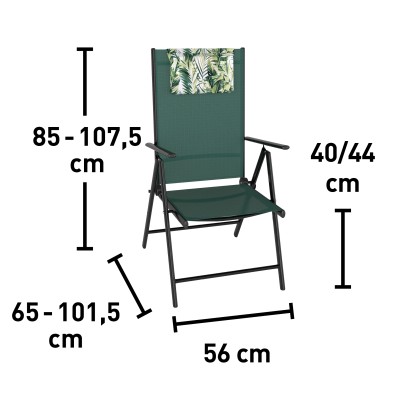 A Travessa összecsukható szék egy praktikus ülőalkalmatosság a teraszra és az erkélyre. Összecsukható, egyszerűen szállítható és helytakarékosan tárolható. Kényelmes méretű ülőfelülettel, magas háttámlával és két kartámasszal rendelkezik. Mérete 56 cm x 107,5 cm x 65 cm (Ma x Sz x Mé). Ülésmagassága 85 cm. Antracitszínű váza alumíniumból és acélból készült. A zöld huzat 100% textilből készült. A több fokozatban állítható háttámla kényelmes ülőhelyzetet teremt. A kartámaszok lekerekített kialakításúak. A fej megtámasztásához fejpárnával rendelkezik.