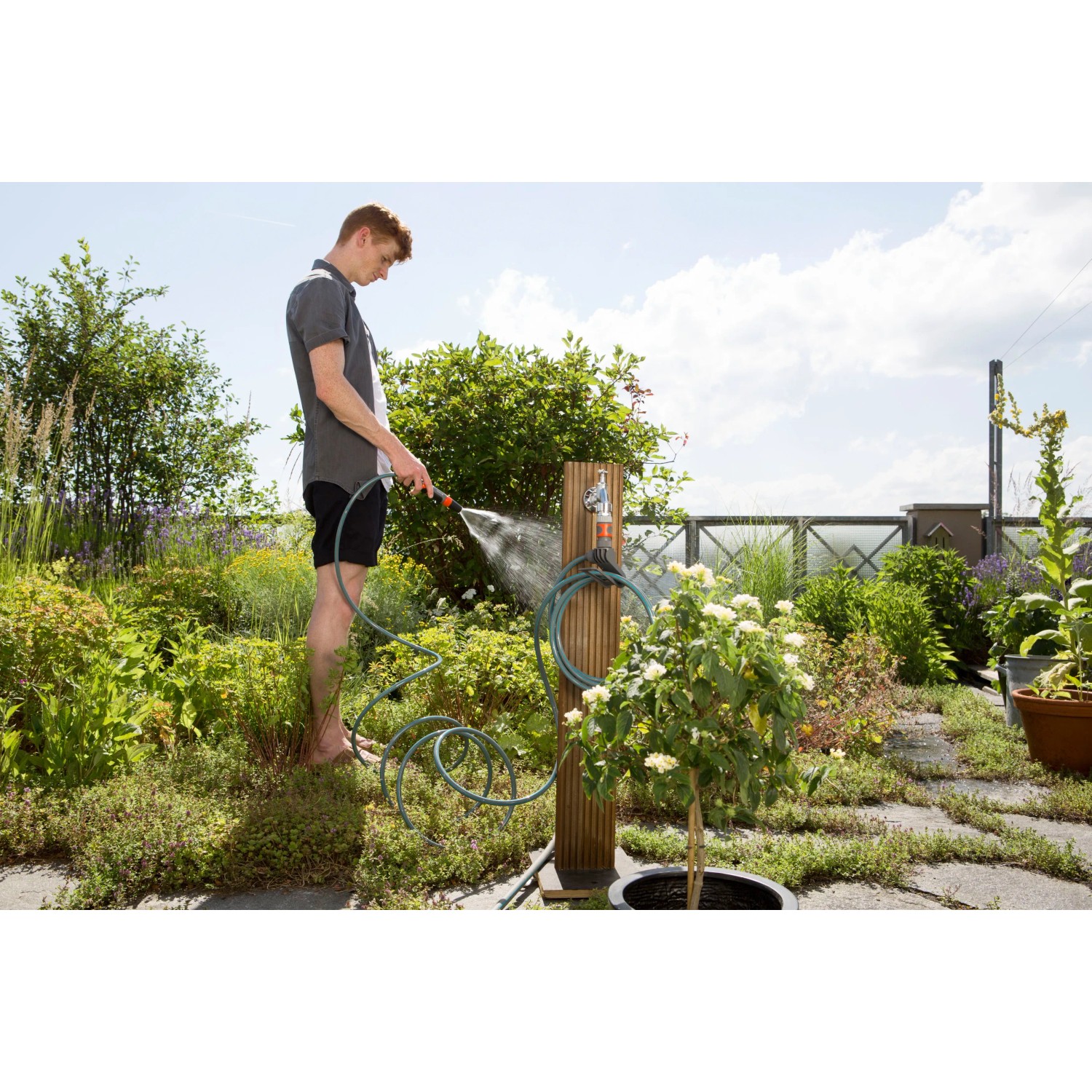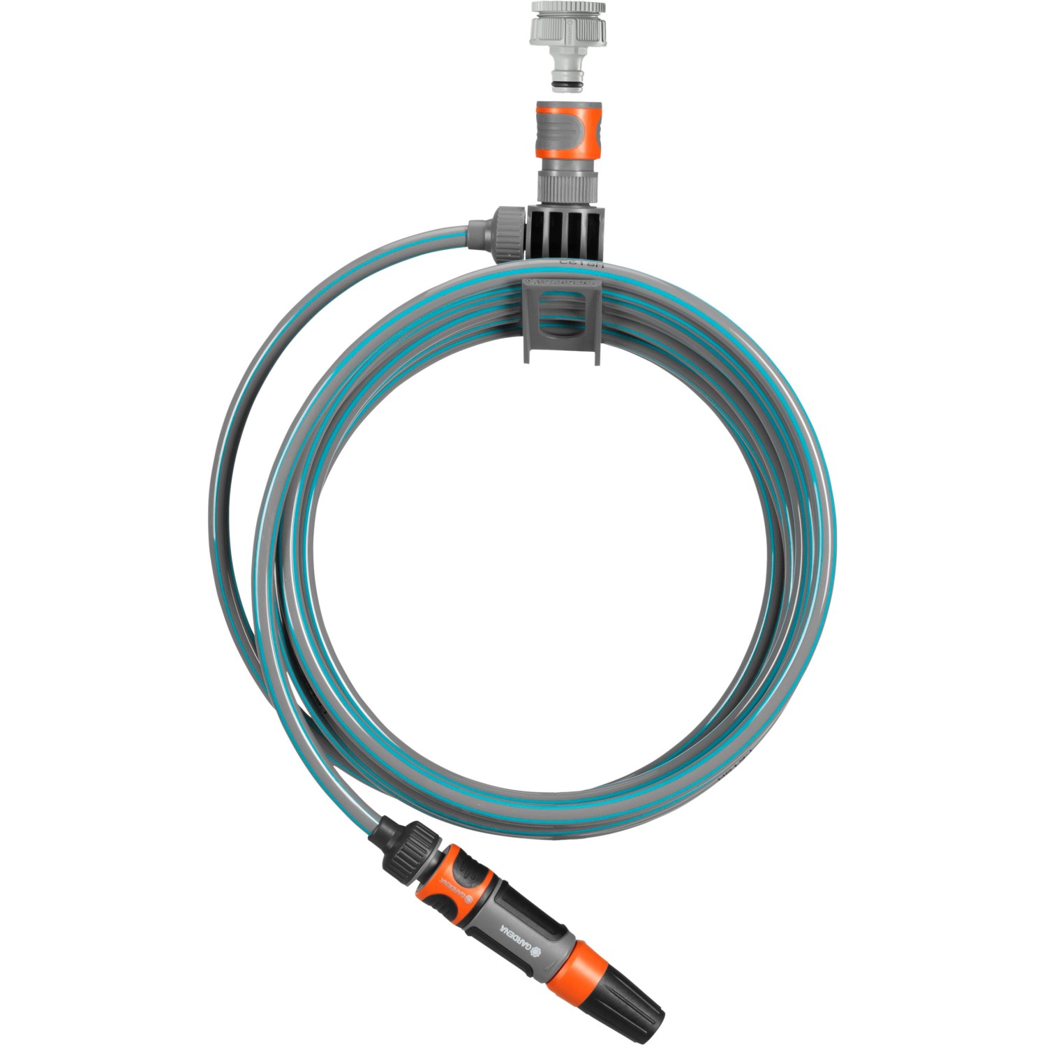 A Gardena terasz spiráltömlő praktikus teljes készlet csapcsatlakozóval és tisztító locsolófejjel.