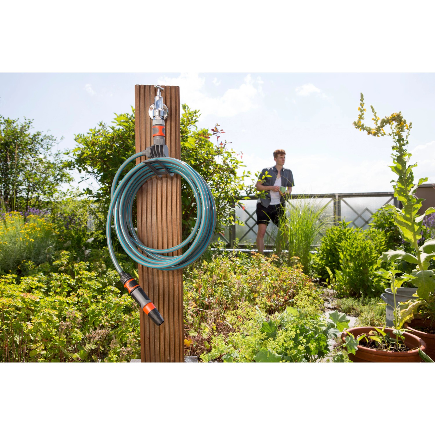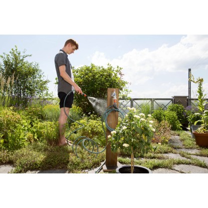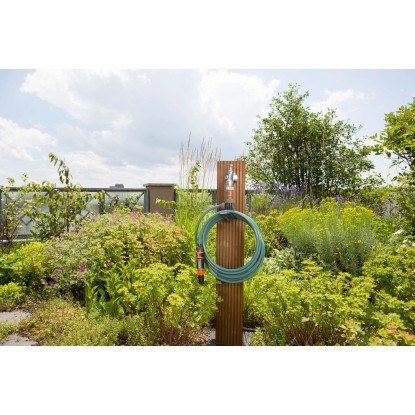 A beépített tartó révén a tömlő helytakarékosan tárolható a csapon, és mindig használatra kész. A bevált minőségnek köszönhetően a tartó, a tömlő és a vízcsap fixen csatlakozik - minden tökéletesen összeillik és tömített marad.