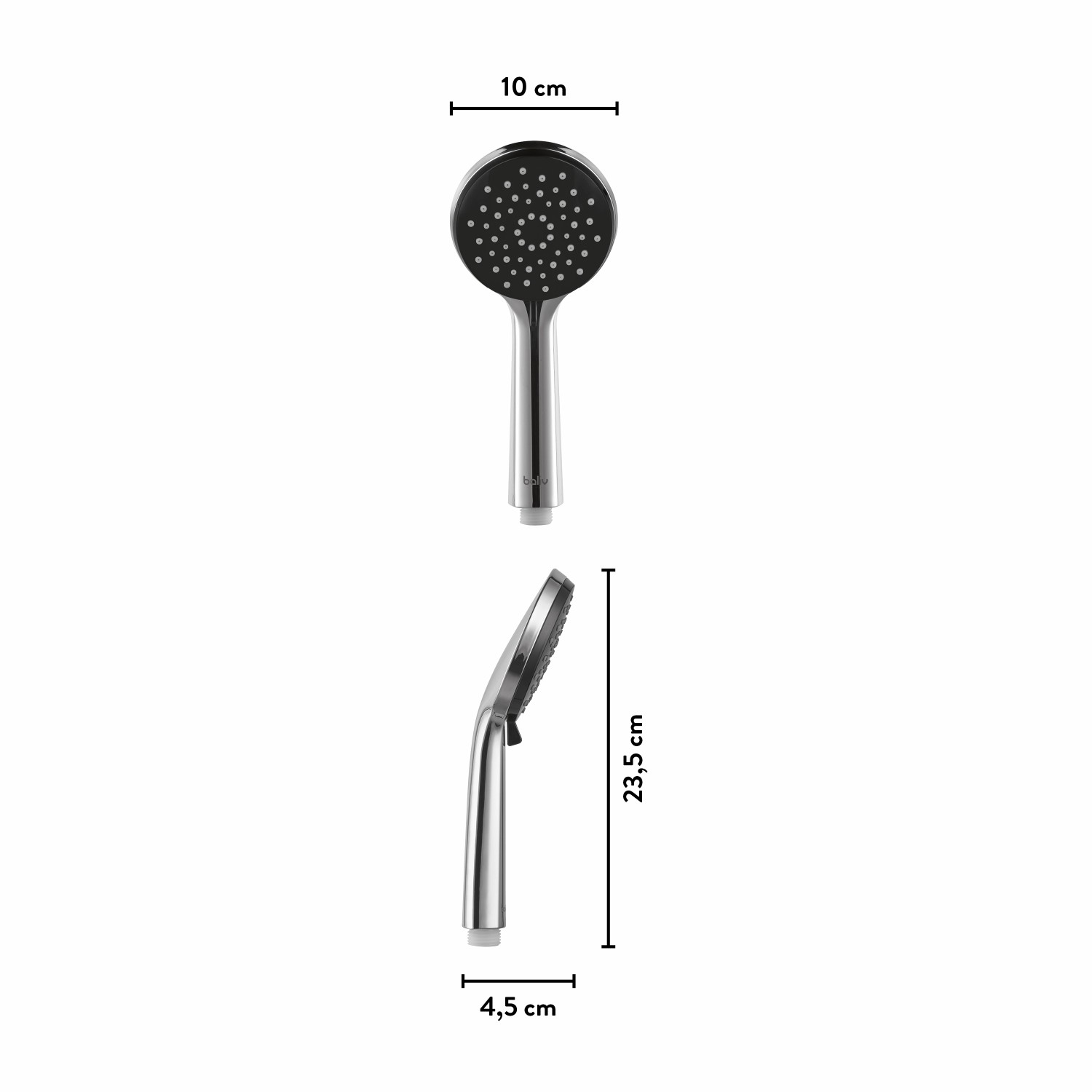 A zuhanytartozék a felhasznált anyagok kiváló minőségének köszönhetően robusztus és tartós. Mivel te is olyan fürdőszobát szeretnél, amely tartós, ezért minden alkatrész fémből készült. A változatos zuhanyzási élmény érdekében a kézi zuhany háromféle zuhanysugárral rendelkezik, amelyek egy forgatható tárcsával választhatók ki. Így kedved szerint választhatsz a masszírozó vagy élénkítő zuhanyok közül. A praktikus vízkőtlenítő fúvókáknak köszönhetően sok időt takaríthatsz meg a tisztítás során, mivel ők védik a zuhanyt a bosszantó vízkőlerakódásokkal szemben. A kézi zuhany 23,5 cm hosszú, így kellemes zuhanyzási élményt nyújt. Azt szeretnénk, ha wellness-élményben lenne részed. Ezért a zuhanytartozék 21 mm-es (G 1/2) szabványos csatlakozóval rendelkezik, így minden szabványos zuhanycsőhöz illeszkedik.