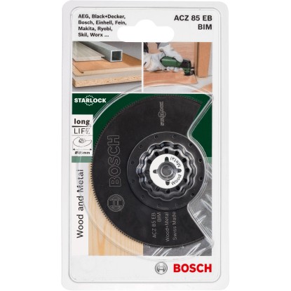 A multifunkciós szerszámokhoz való Bosch Starlock BIM ACZ 85 EB Wood and Metal szegmens fűrészlap ajtótokok levágására használható a padlón (puhafa, keményfa, furnérlemezek, műanyagbevonatú lemezek), tovább laminált padló/parketta kivágására (pl. válaszfal beépítéséhez), és kisebb profillécek (pl. alumínium padló takarólécek) levágására. Gipszkartonhoz korlátozottan használható.