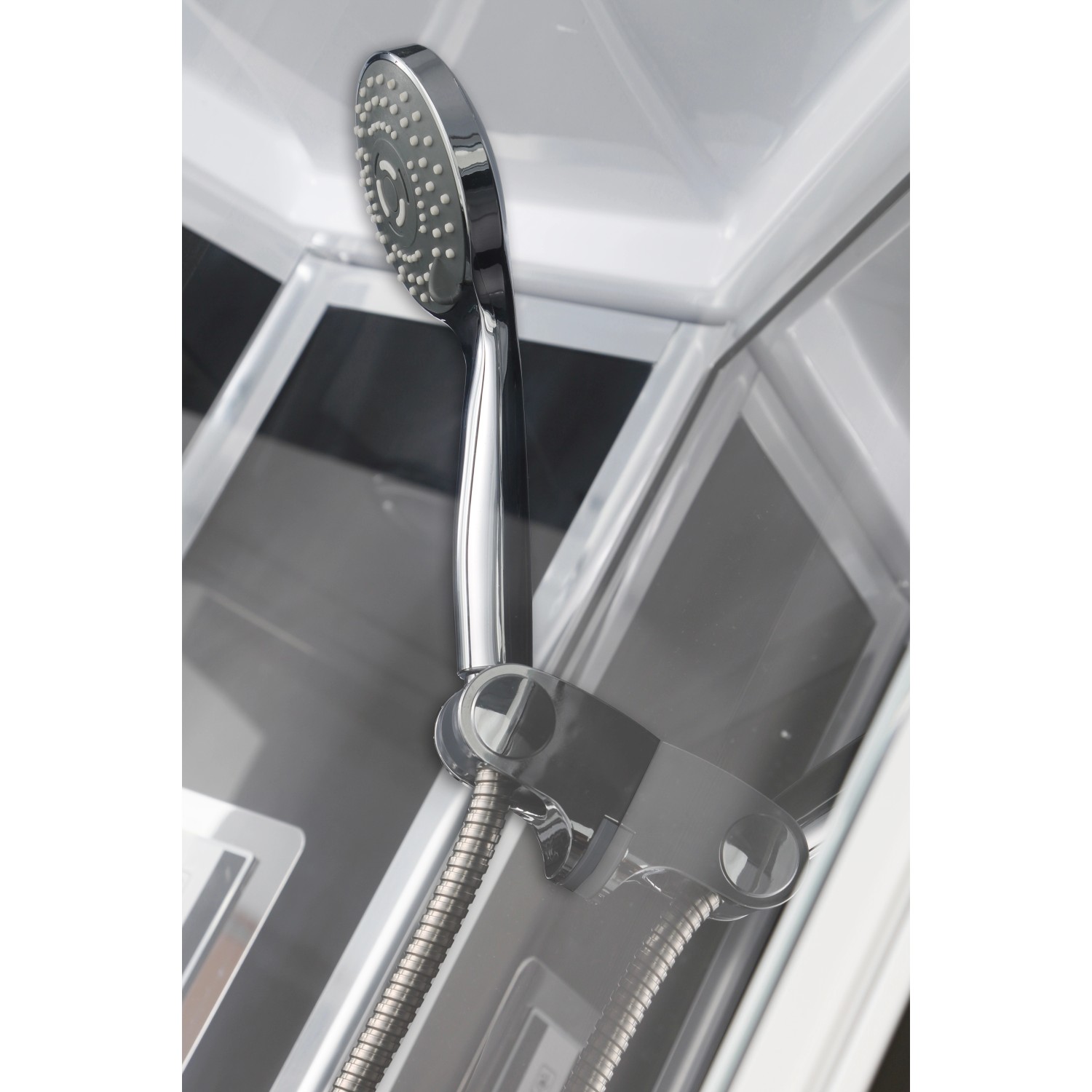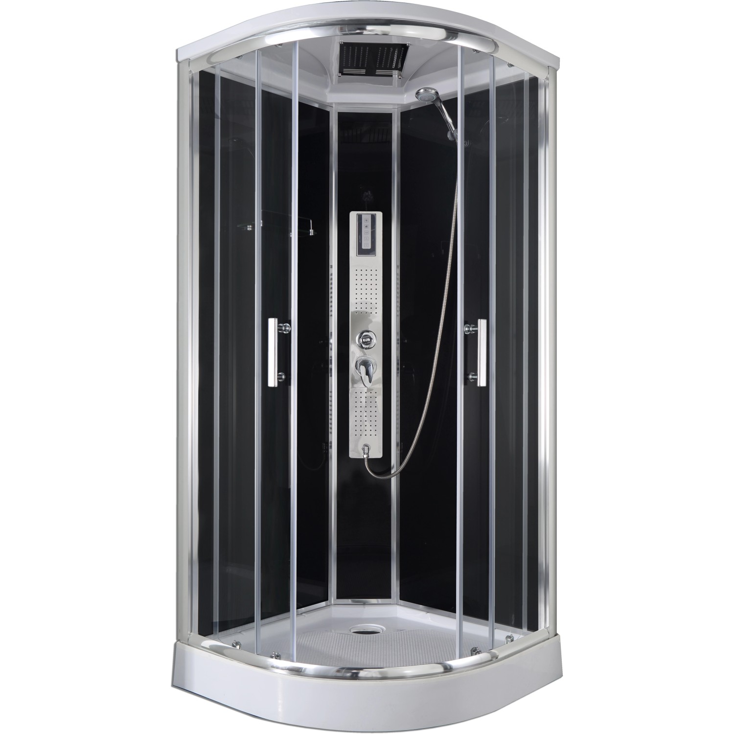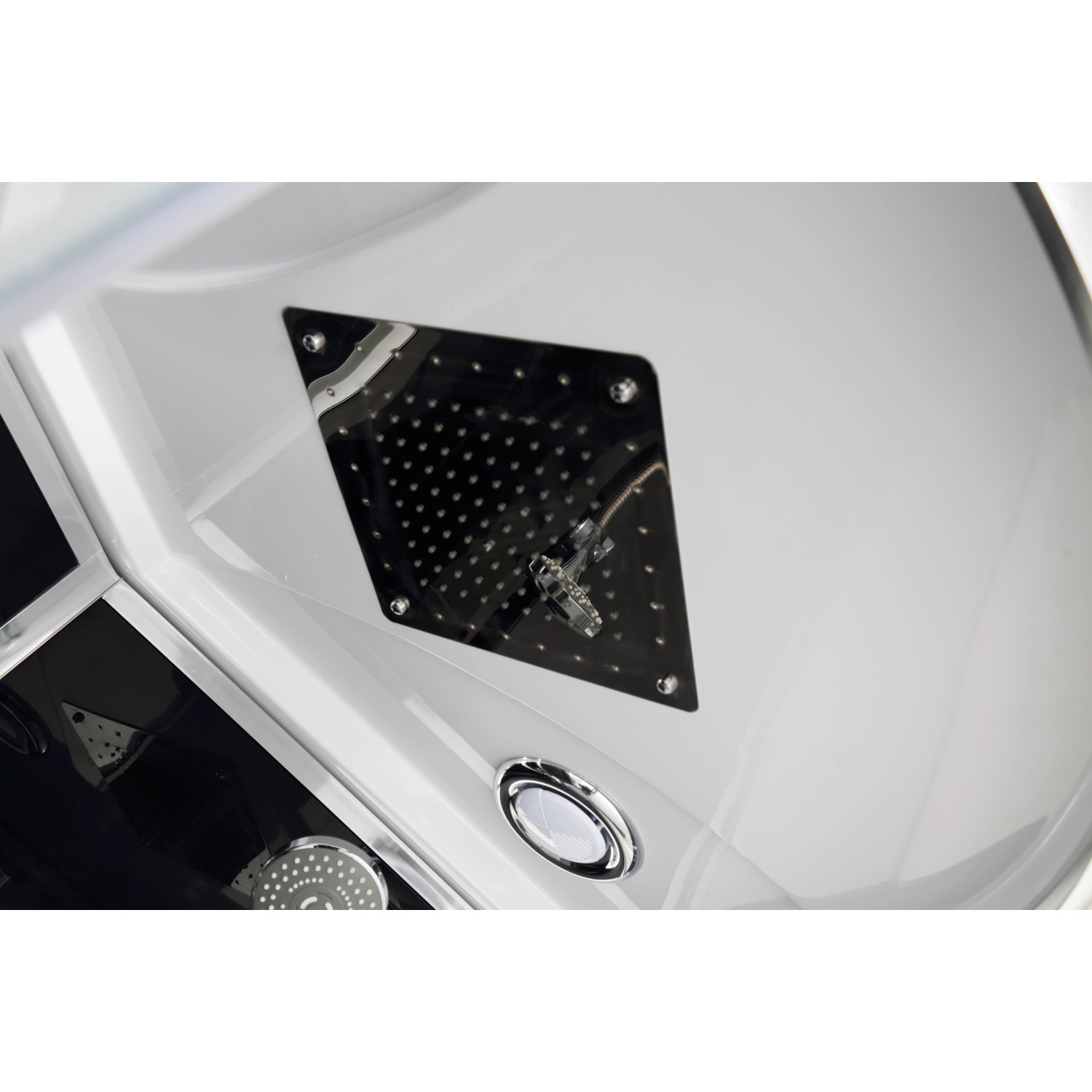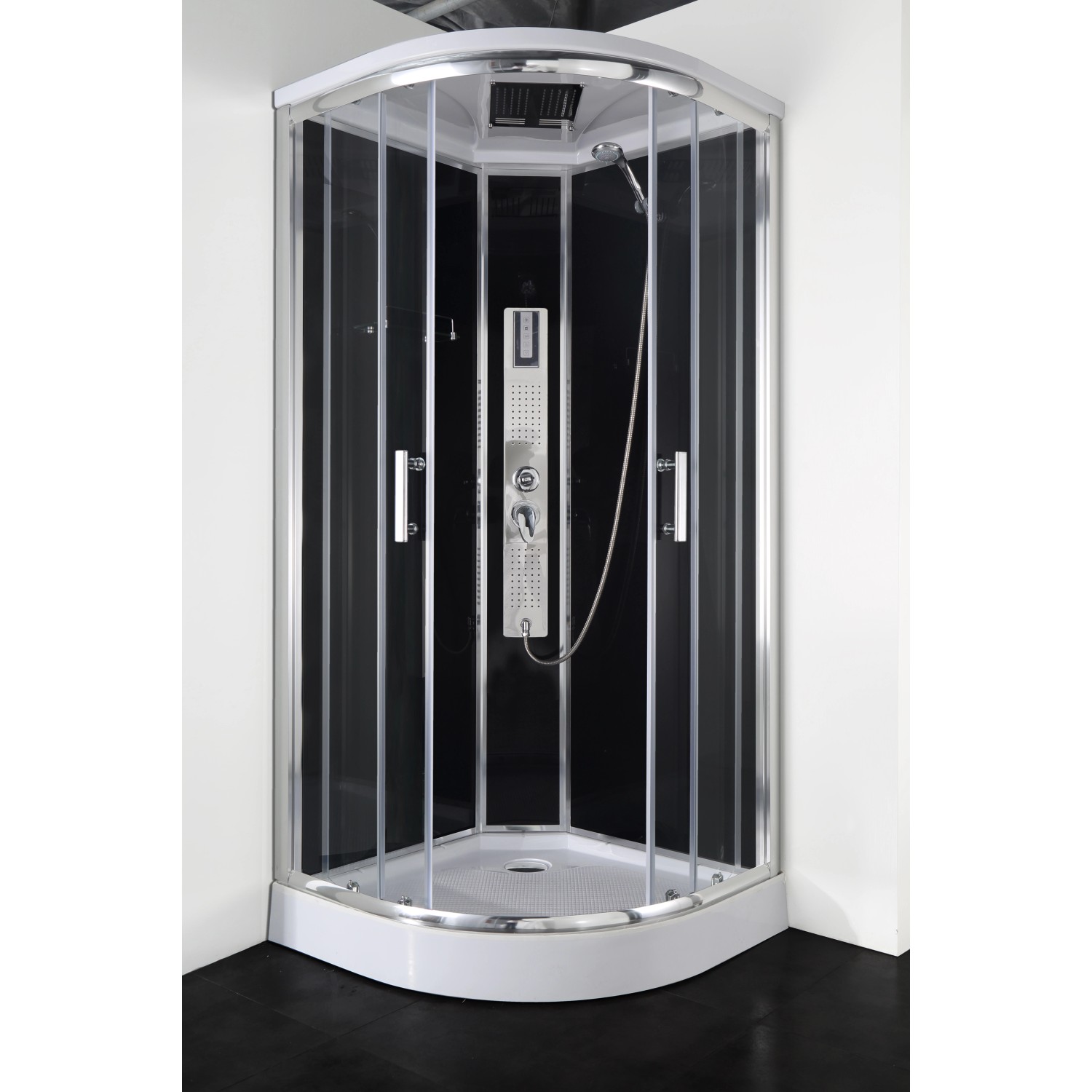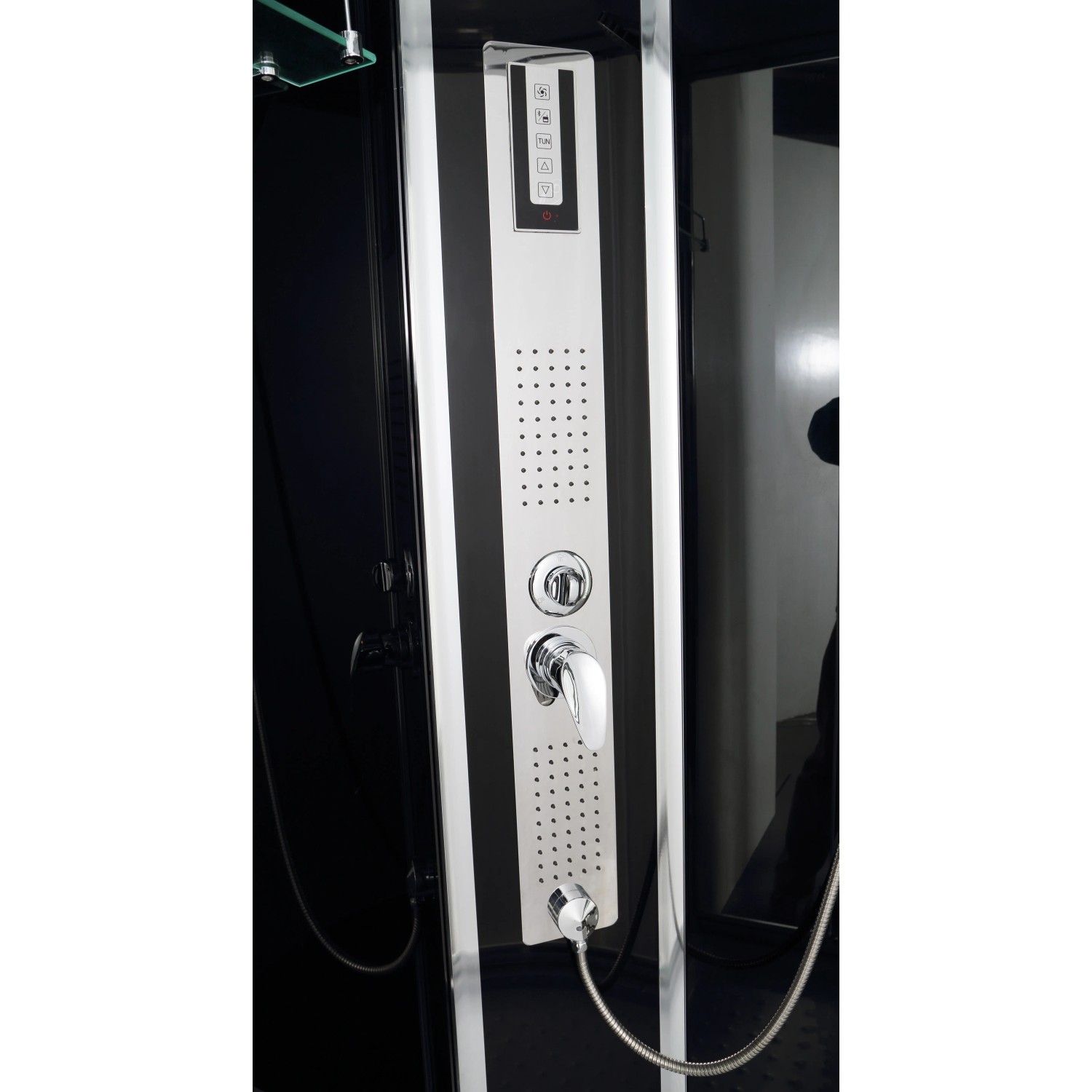 Emellett a rozsdamentes acélból készült fej feletti zuhanyrózsával, állítható kézi zuhanyfejjel és nagyfelületű masszázsfúvókákkal felszerelt ívelt falú zuhanyfülke pihentető pillanatokat kínál. Formatervezése a 4 mm-es fekete hátsó falnak, az elegáns króm profiloknak, a színezett ajtónak, a színezett fix üvegrésznek, az üvegpolcnak, a dupla görgőknek és a beépített masszázsfúvókákkal rendelkező fekete üvegpanelnek köszönhetően megnyerő. Ezenkívül zuhanyváltós egykaros keverős csapteleppel és érintős kezelőfelülettel is rendelkezik.
