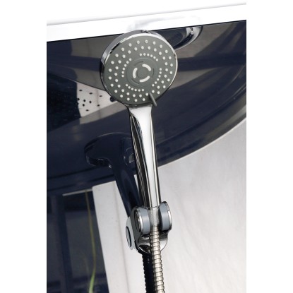 Emellett a rozsdamentes acélból készült fej feletti zuhanyrózsával, állítható kézi zuhanyfejjel és nagyfelületű masszázsfúvókákkal felszerelt sarokzuhany pihentető pillanatokat kínál. Formatervezése a 4 mm-es fekete hátsó falnak, az elegáns króm profiloknak, a színezett ajtónak, a színezett fix üvegrésznek, az üvegpolcnak, a dupla görgőknek és a beépített masszázsfúvókákkal rendelkező fekete üvegpanelnek köszönhetően megnyerő. Ezenkívül zuhanyváltós egykaros keverős csapteleppel és érintős kezelőfelülettel is rendelkezik.