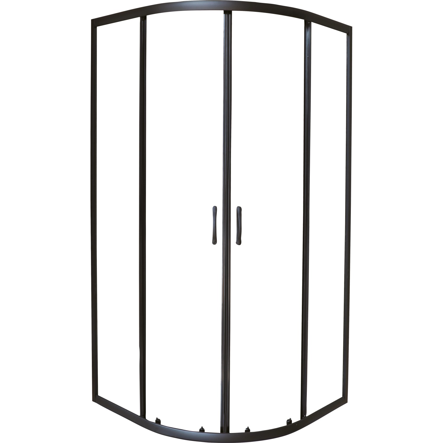 Félköríves, 80 x 80 cm, fekete krómozott alumínium profil, dupla tolóajtó, 4 mm-es, átlátszó biztonsági üveg. Zuhanytálcával, akril, fehér, lefolyó garnitúrával.