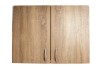 Laminált forgácslapból készült felsőszekrény, fehér korpusszal, sötét tölgy fronttal.