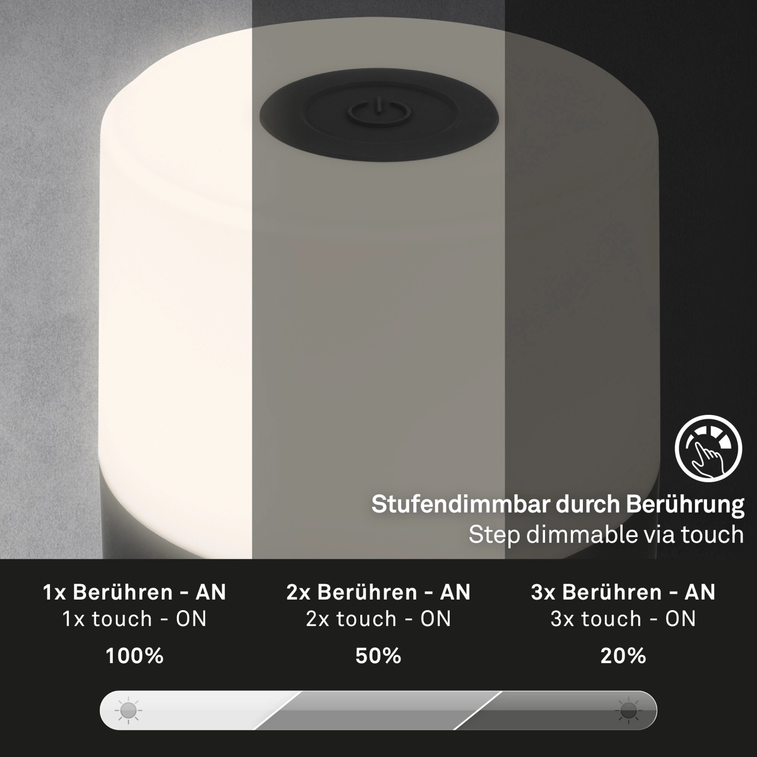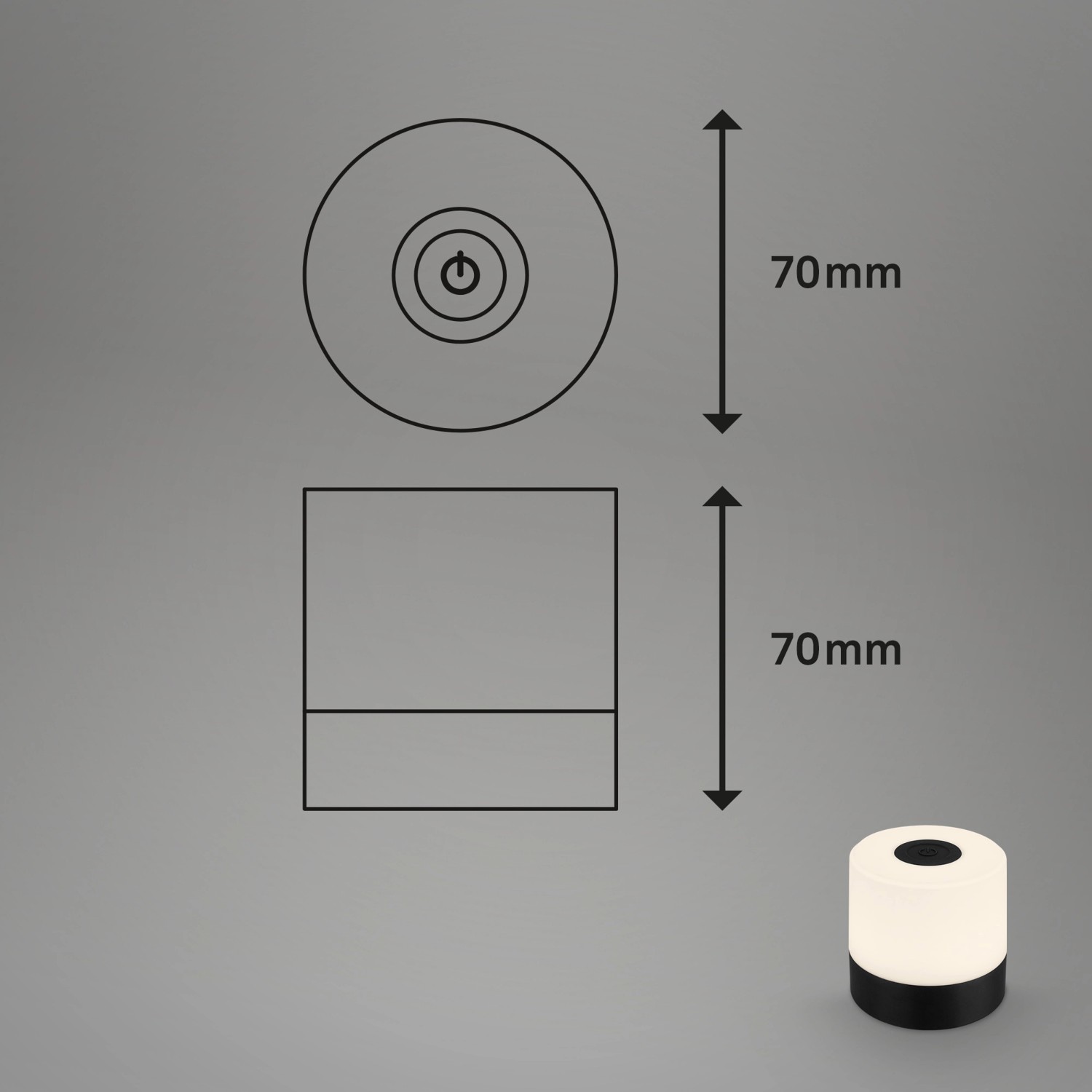 A 7 cm magas és kisméretű mini gyermeklámpa szinte bárhol elhelyezhető. 3 fokozatban szabályozható a fényereje, és mini éjjeli lámpaként, dekoratív éjszakai lámpaként, mobil asztali lámpaként vagy dekoratív világításként tökéletes. A 2700 Kelvin hőmérsékletű melegfehér fény pihentető légkört teremt a nappaliban, az előszobában, a hálószobában, vagy akár az erkélyen vagy a teraszon töltött grillezős estéken.