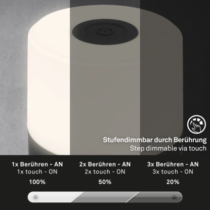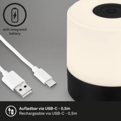 Az akkumulátoros LED-es asztali lámpa az IP44 védettségnek megfelelően fröccsenő víz elleni védelemmel rendelkezik, így kempingezéskor, a szabadban vagy a teraszon is gond nélkül használhatja, még akkor is, ha kissé vizesek a körülmények. A lámpa kényelmesen feltölthető a csomag részét képező USB-C kábellel. 70 mm x 70 mm (átmérő x magasság) méretével ez a vezeték nélküli lámpa praktikus és sokoldalúan használható.