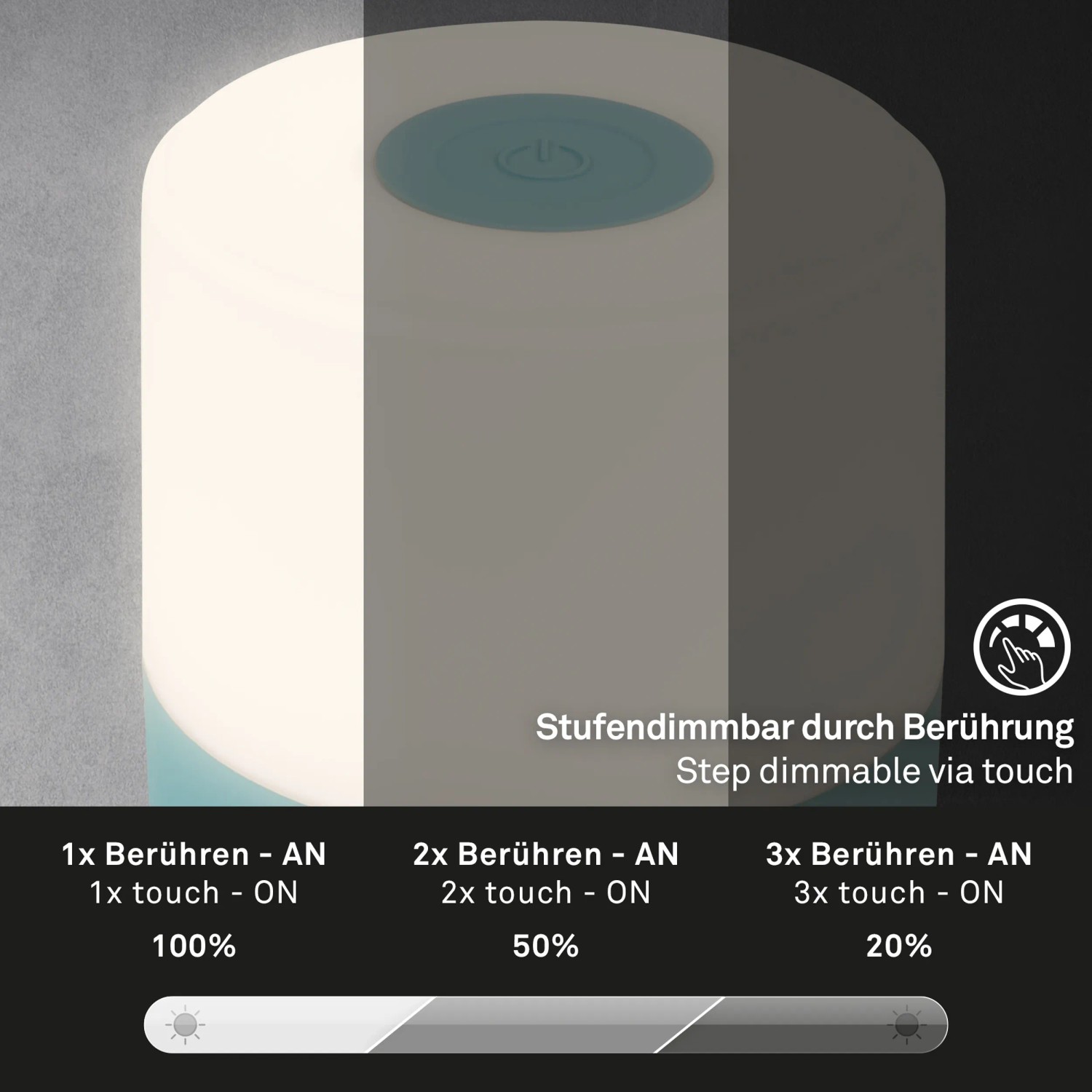Az akkumulátoros LED-es asztali lámpa az IP44 védettségnek megfelelően fröccsenő víz elleni védelemmel rendelkezik, így kempingezéskor, a szabadban vagy a teraszon is gond nélkül használhatja, még akkor is, ha kissé vizesek a körülmények. A lámpa kényelmesen feltölthető a csomag részét képező USB-C kábellel. 70 mm x 70 mm (átmérő x magasság) méretével ez a vezeték nélküli lámpa praktikus és sokoldalúan használható.
