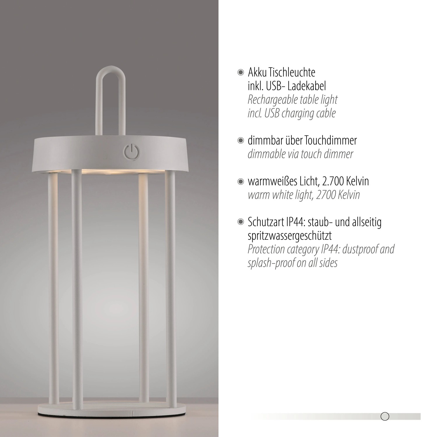 Az akkumulátoros lámpa akár 7 órán át is kellemes, melegfehér fényt biztosít. A töltés egyszerűen a mellékelt USB-kábellel történik, és mindössze körülbelül 4 órát vesz igénybe, így a lámpa gyorsan újra használatra kész.