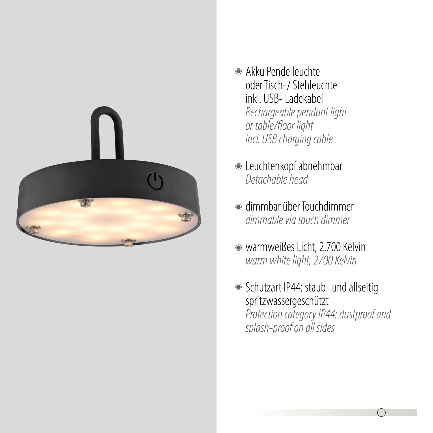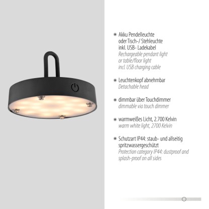 Az Akuba akkumulátoros LED-es függőlámpa sokoldalú társ bel- és kültéren egyaránt. Az elegáns fehér lámpa maximális rugalmasságot biztosít: Használható fákra vagy bokrokra erősített függőlámpaként, valamint asztali lámpaként is elhelyezhető asztalok, munkalapok, tálalók stb. fölött. A 36 cm átmérőjű akkumulátoros lámpa a hatékony megvilágítást ötvözi a dekoratív kialakítással.