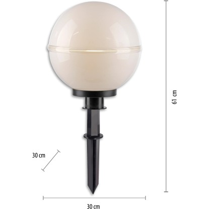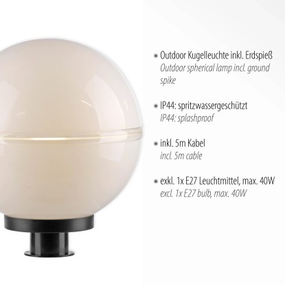 Kombinálja a gömblámpát bármilyen, ízlésének megfelelő izzóval. Használhat színes izzókat is, amelyekkel gyönyörű színhangulatokat teremthet a ház és a kert körül. Az IP44 védettségnek köszönhetően bel- és kültéri használatra egyaránt alkalmas. A gömblámpa egy 5 méteres kábellel és egy földbe szúrható tüskével felszerelt.
