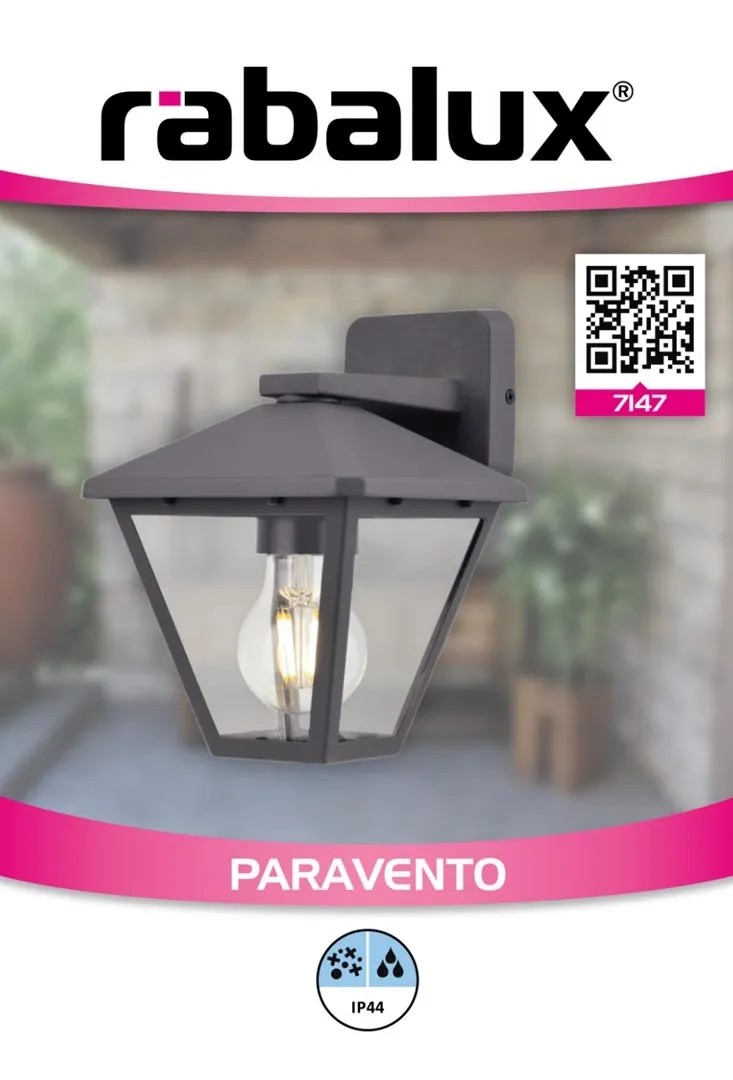 A lefelé világító Paravento kültéri fali lámpa a klasszikus stílus képviselői közé tartozik. Az alumíniumból készült fekete lámpatestet lefelé szűkülő, átlátszó üvegbúra és lekerekített sarkakkal tervezett szögletes dísztalp egészíti ki. A lefelé csüngő, négyszögletes búrával körülvett lámpafejet a dísztalpból kinyúló vízszintes elem tartja. A búra teljesen zárt, felülről kalapszerű fedél borítja. A Paravento jó választás lehet a teraszra - segítségével például megvilágíthatjuk a bejárati ajtó környékét -, de elhelyezhetjük bárhol a ház külső falán. A kültéri lámpa egy darab legfeljebb 40 W teljesítményű fényforrással használható, a foglalat típusa E27. A Paravento méretei a következők: szélessége 160 mm, magassága 220 mm, faltól mért távolsága 195 mm, beépítési átmérője 90 mm. A fali lámpa IP44-es védettsége garantálja, hogy legfeljebb 1 mm átmérőjű tárgyak behatolása ellen, valamint bármilyen irányból fröccsenő víz ellen védett. A Paravento kültéri lámpát fényforrás nélkül szállítjuk.