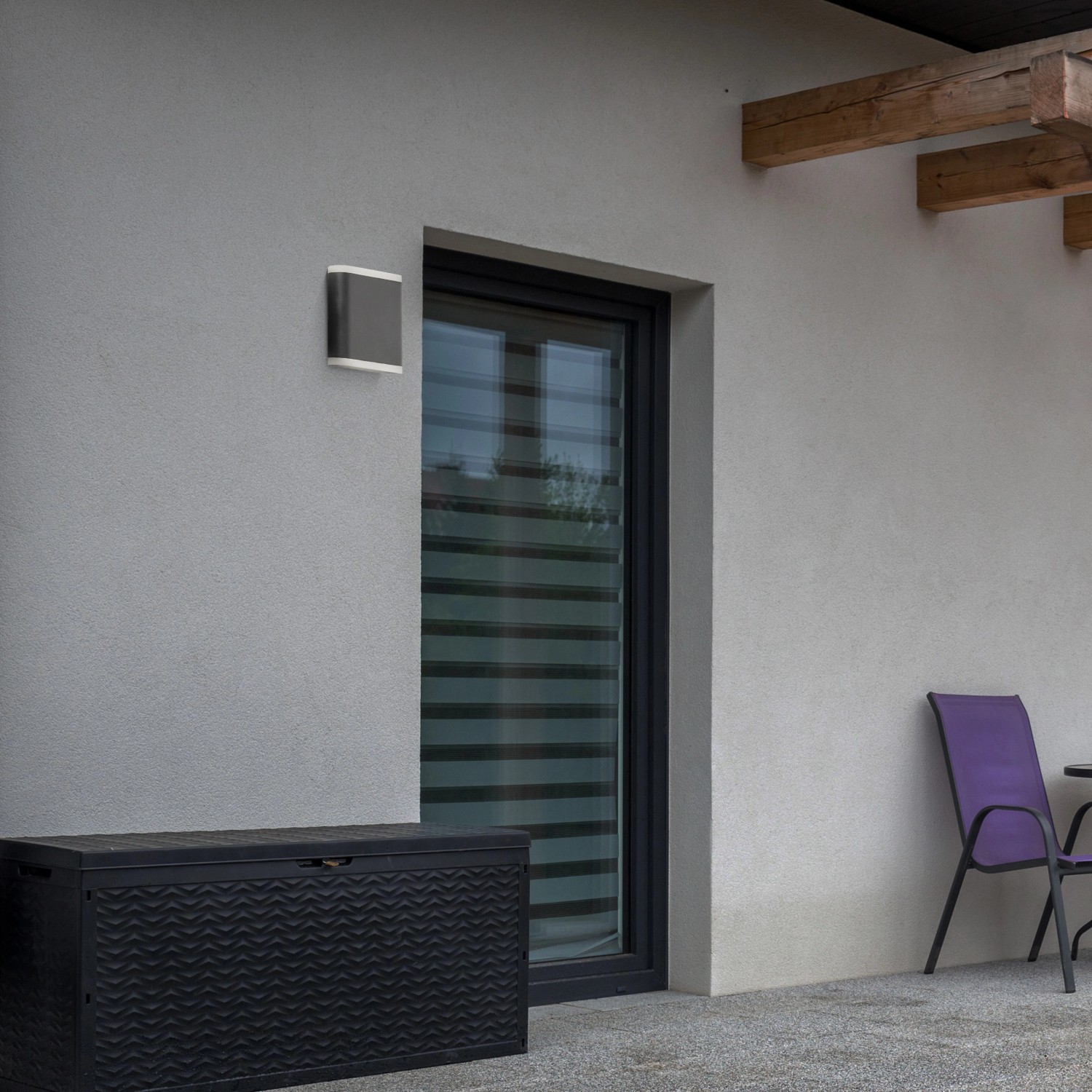 Ez a kültéri lámpa fekete öntött alumíniumból készült, vékony és modern kialakítású, és 2 matt PC-diffúzorral van ellátva, amelyek lehetővé teszik, hogy a fény a lámpa tetején és alján keresztül távozzon. Vékony profiljának köszönhetően nem feltűnő módon világítja meg a tornácokat, teraszokat és teraszokat.