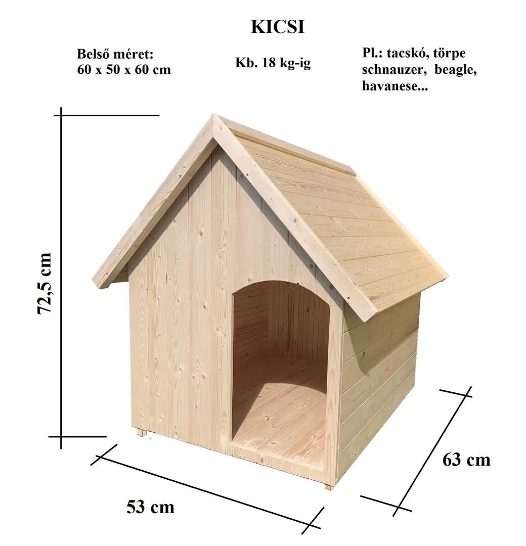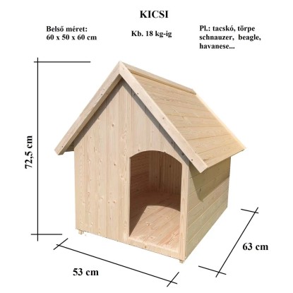 Fenyő kutyaház - kicsi. Fenyőből készült, kis méretű kutyaház. Védelmet nyújt kedvencének időjárás ellen. Felület kezelés nélküli kivitel, használat előtt festeni szükséges. Lapra szerelve, dobozba csomagolva szállítható, otthoni szerelést igényel, a csatolt útmutató alapján. Méretek: 60 cm magas / 50 cm széles / 60 cm mély.