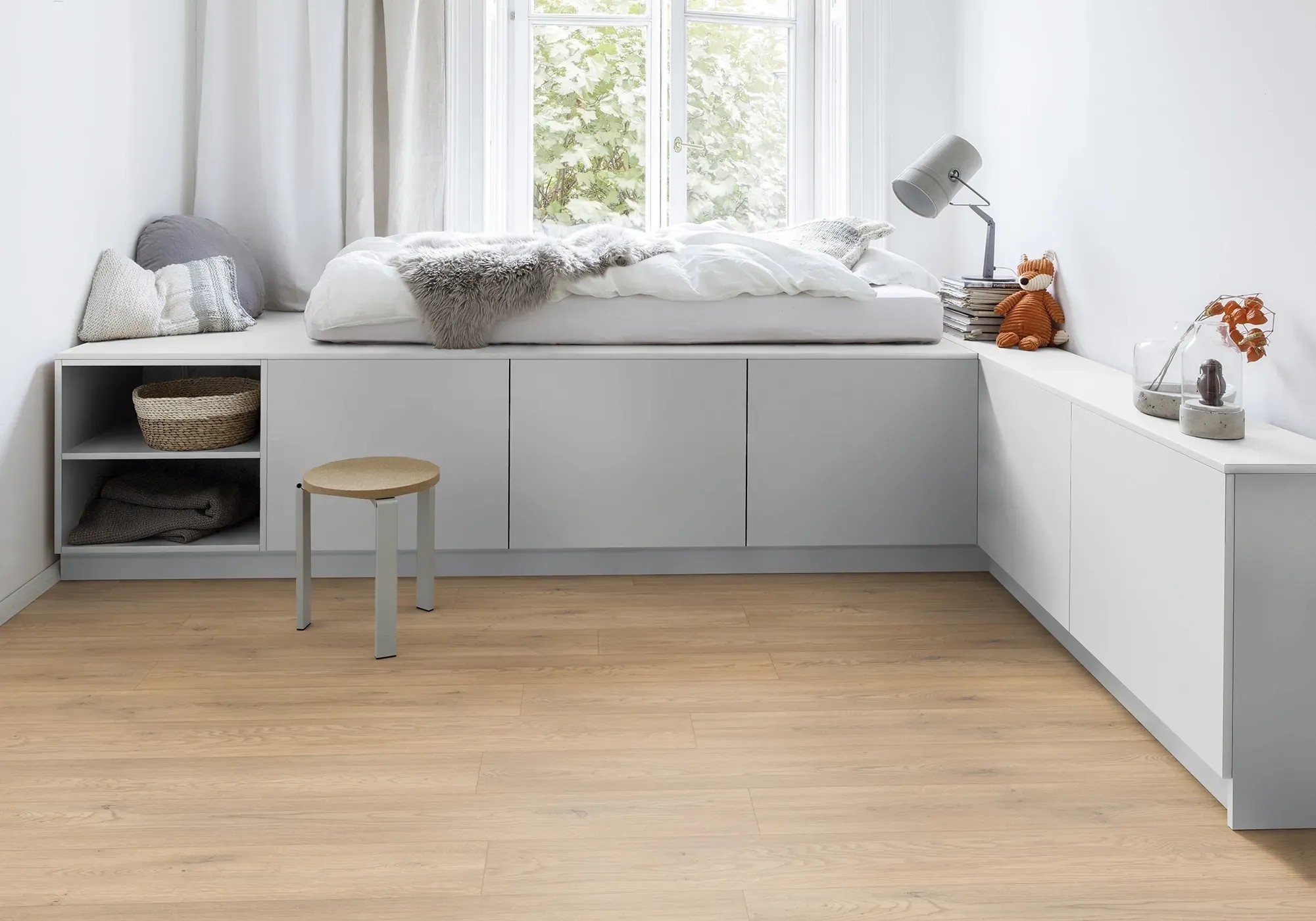 A divatos tölgy megjelenésű, közepes színárnyalatú padló a helyiségnek gyönyörű látványt kölcsönöz, és vonzó összképet teremt. Sima megjelenésének köszönhetően a padlóburkolat számos berendezési stílussal kombinálható.