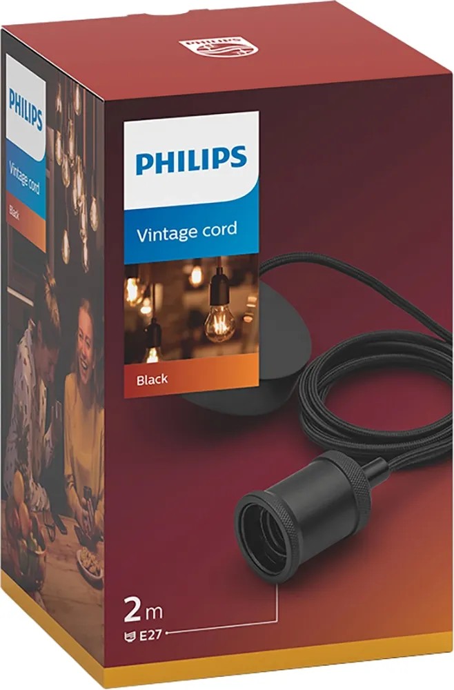 A fekete színű E27-es foglalattal és fekete mennyezeti rózsával rendelkező Philips Vintage zsinórfüggeszték modern hangulatot teremt a lakótérben.