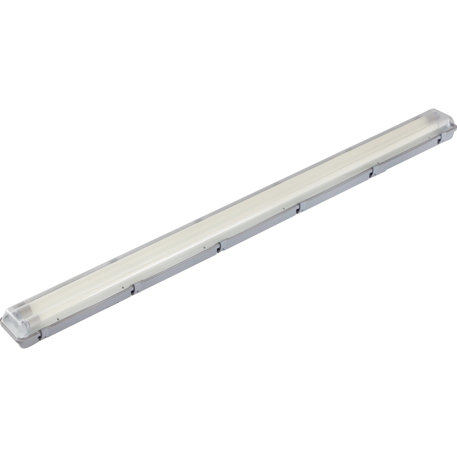 A szürke műanyagból készült, nedvességálló lámpa IP65 védettséggel rendelkezik, így ideális vizes és poros környezetbe, például garázsokba, pincékbe vagy műhelyekbe. A 156,5 x 11,5 x 8,5 cm méretű lámpa ellenálló háza megbízhatóan védi a beépített fényforrást a fröccsenő víztől és az idegen testektől. Így még a nehéz körülmények között is megbízható és erős világítást biztosít.
