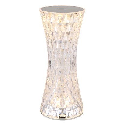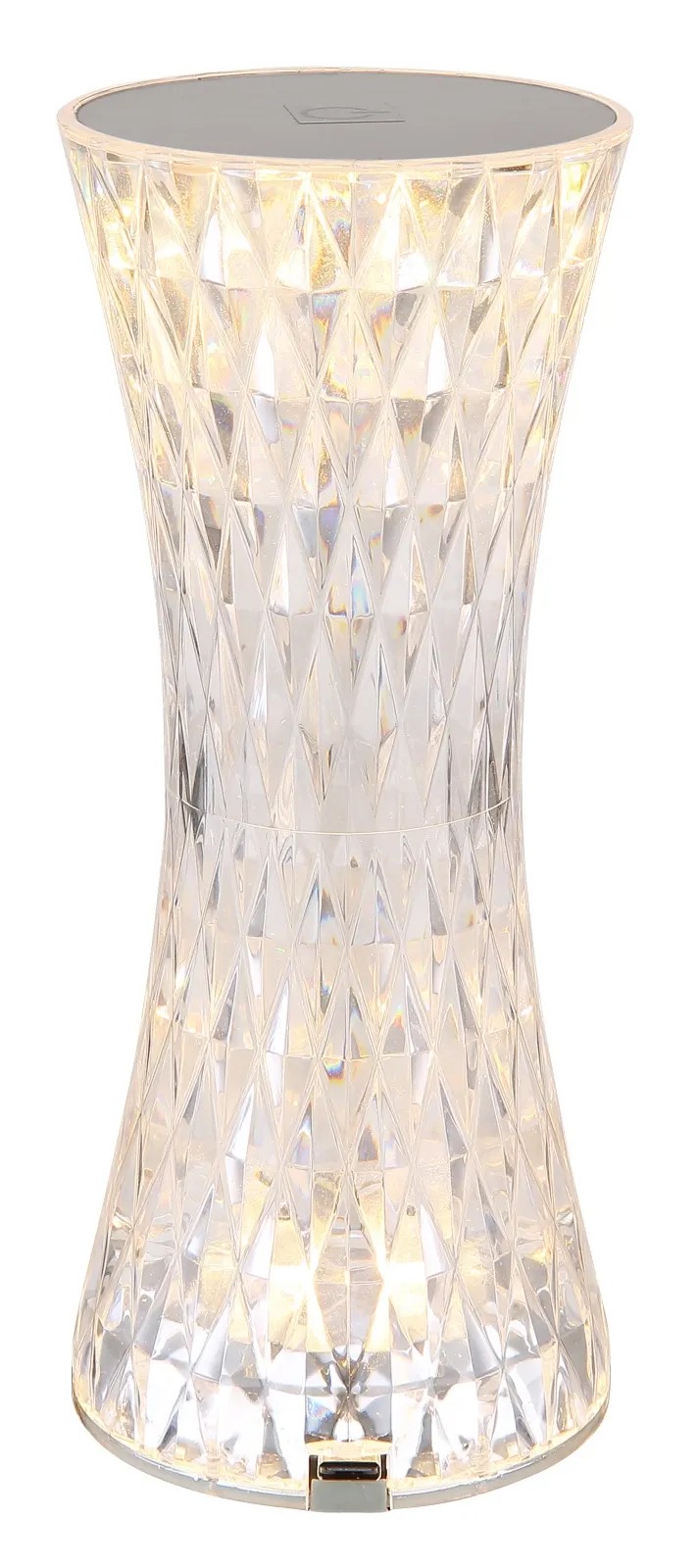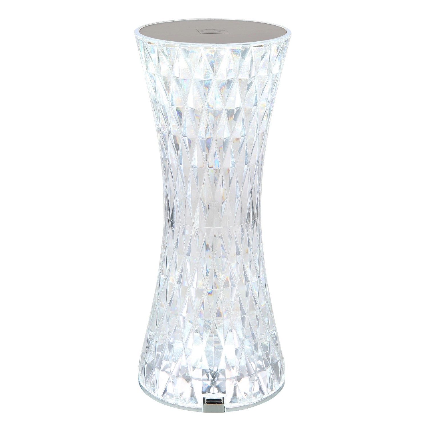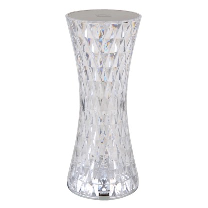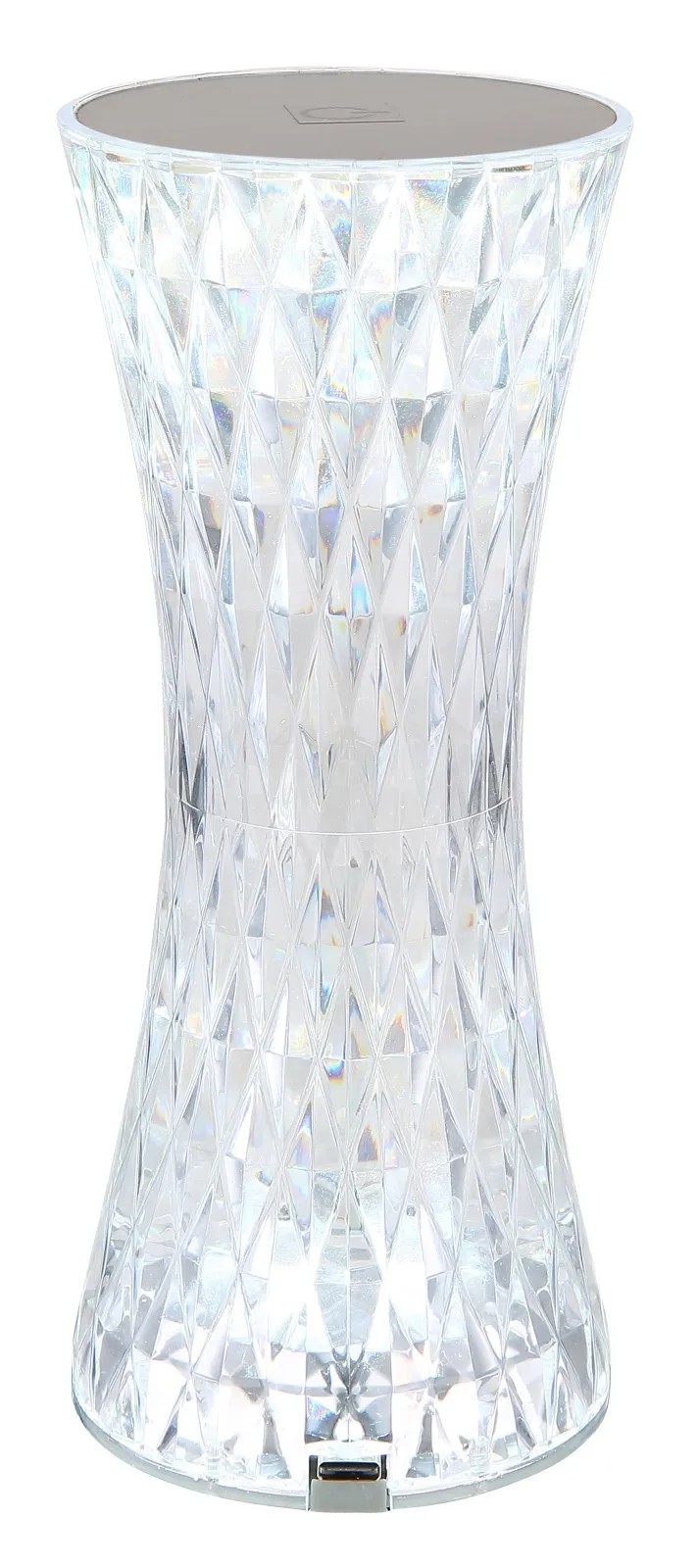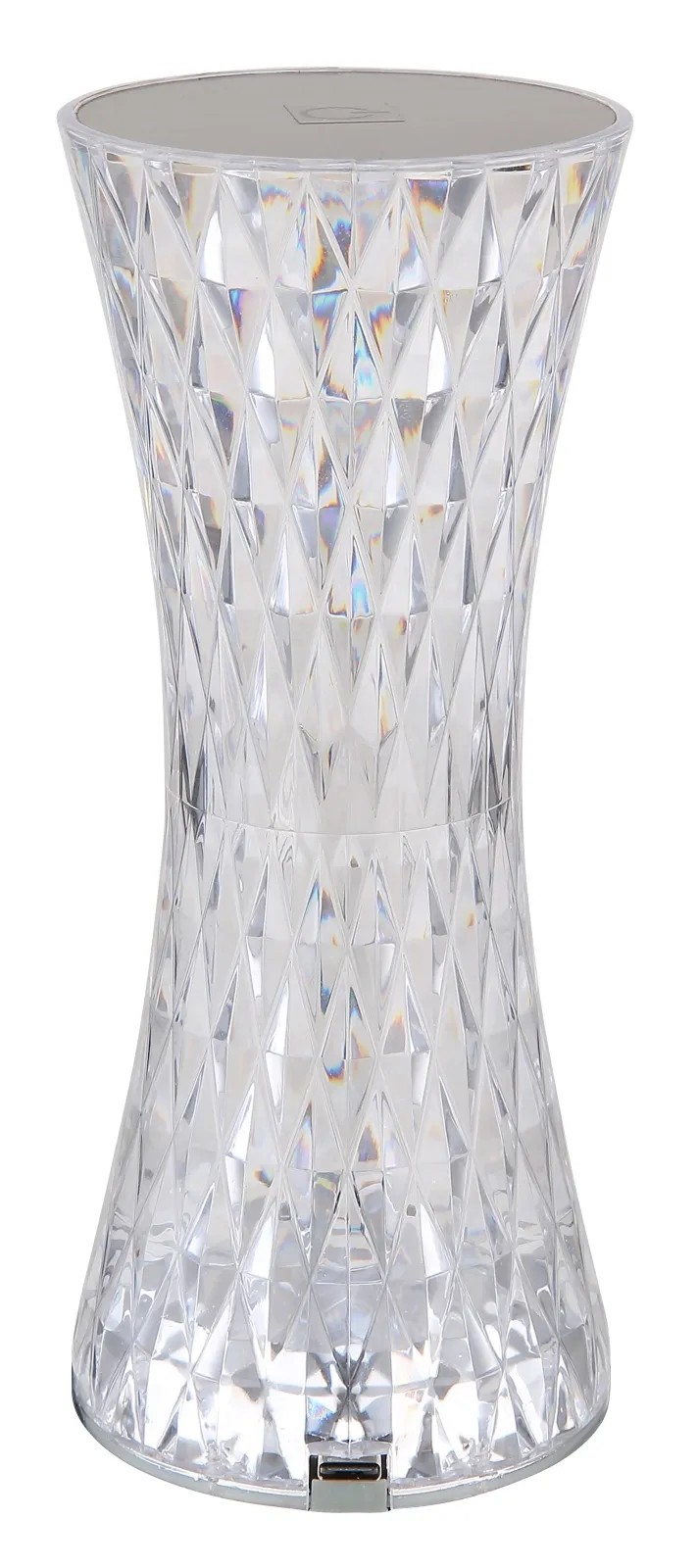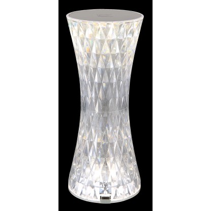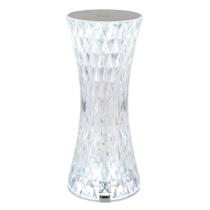 Asztali lámpa műanyag átlátszó kristály hatású, fém ezüst, kábel PVC fehér, érintés be/ki, RGB színváltó, RGB színek fixálhatók, USB, egyéb funkciók: RGB színek érintéssel válthatók, akkuval, 800mAh 3,7V , : 80mm, M:185mm, , RGBW LED-del 1,5W 5V.