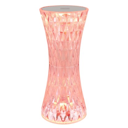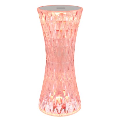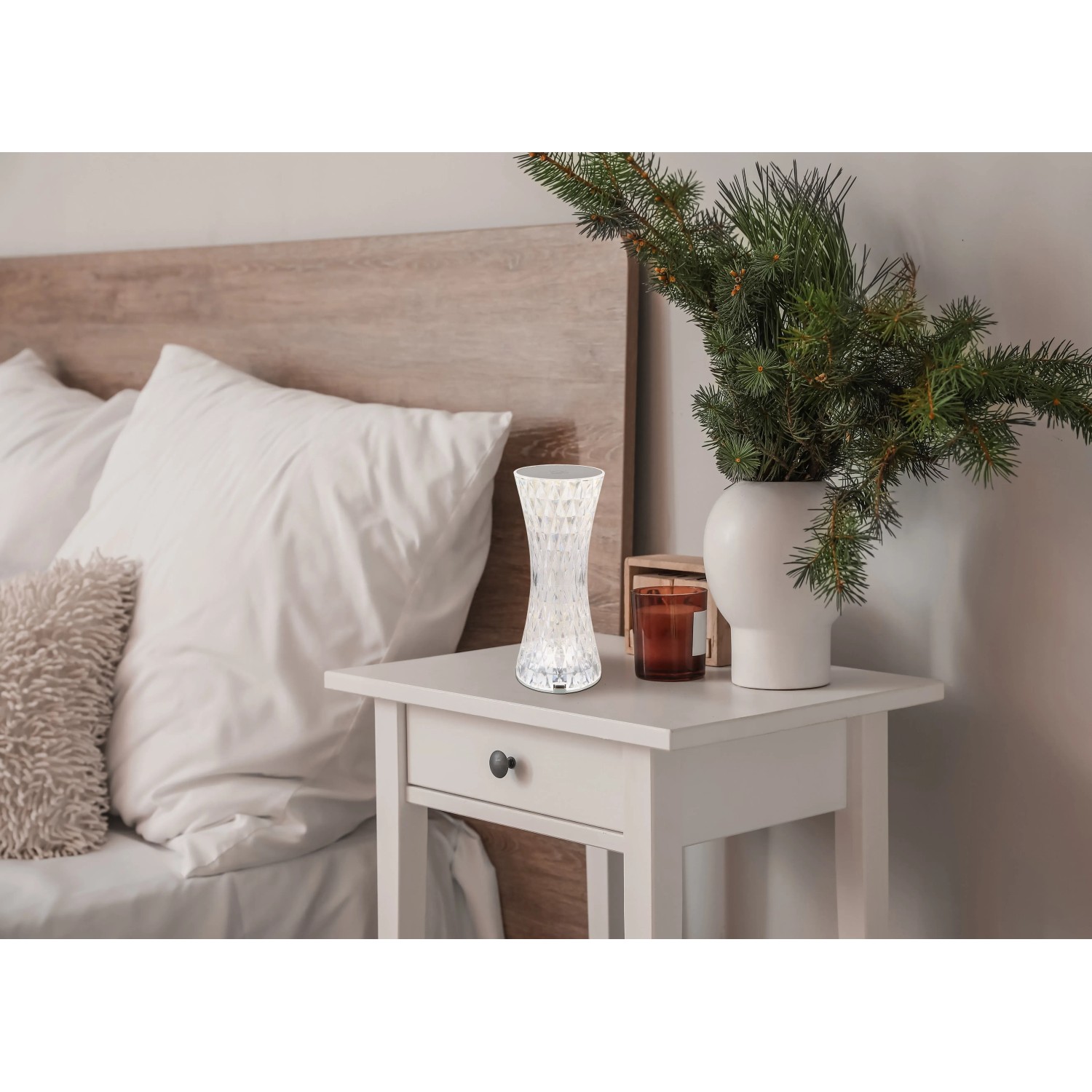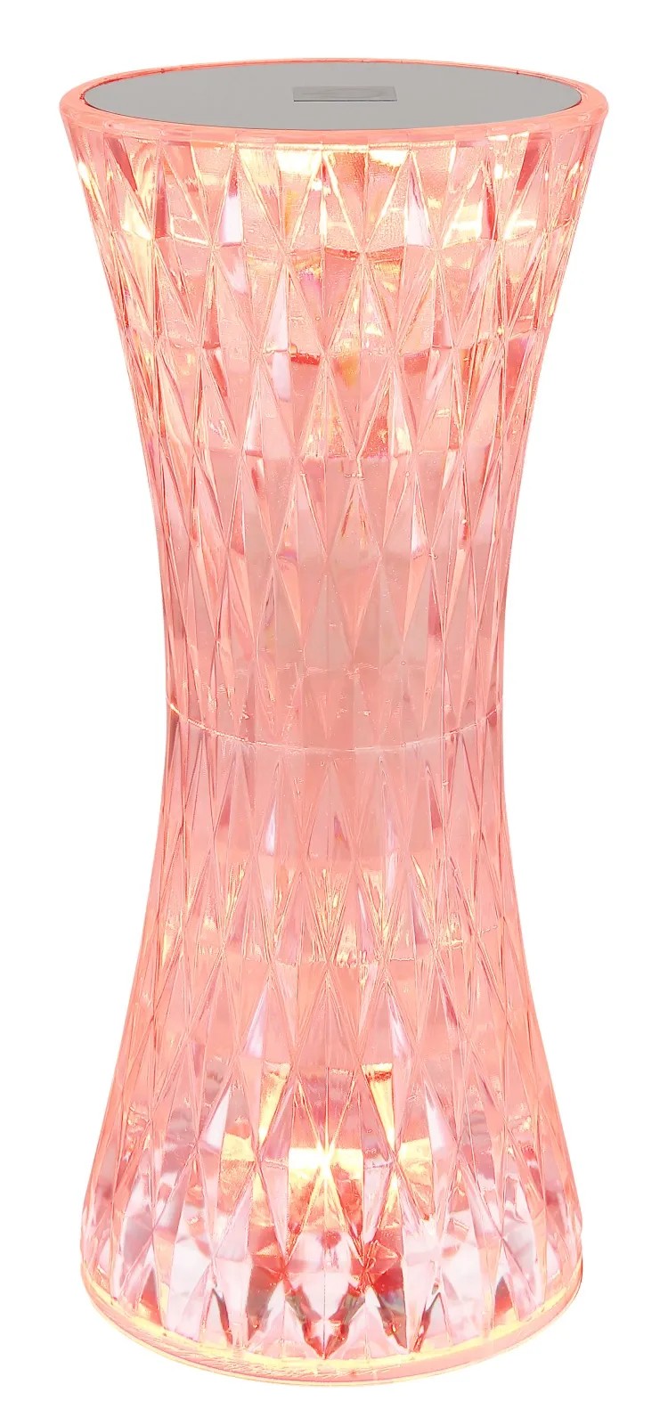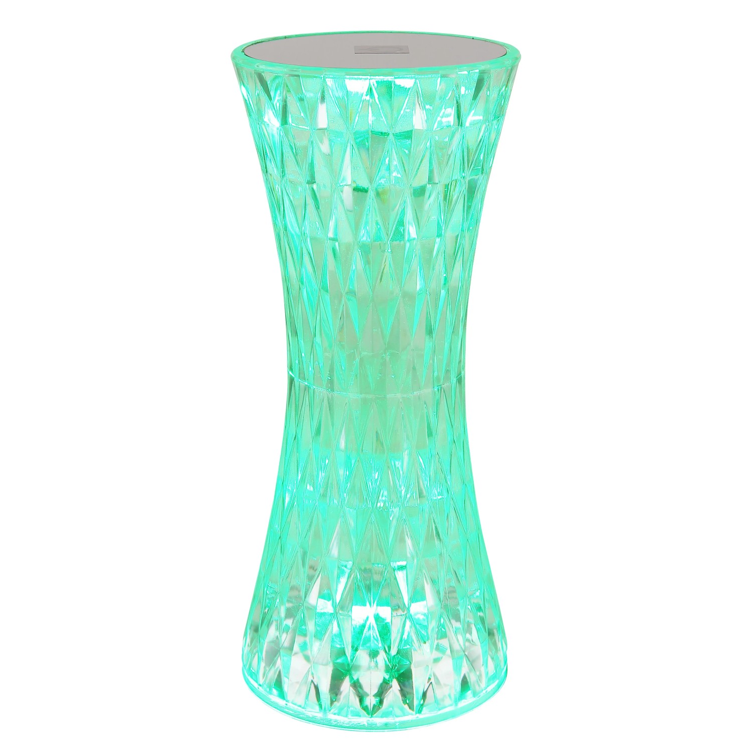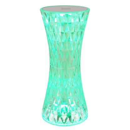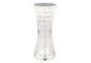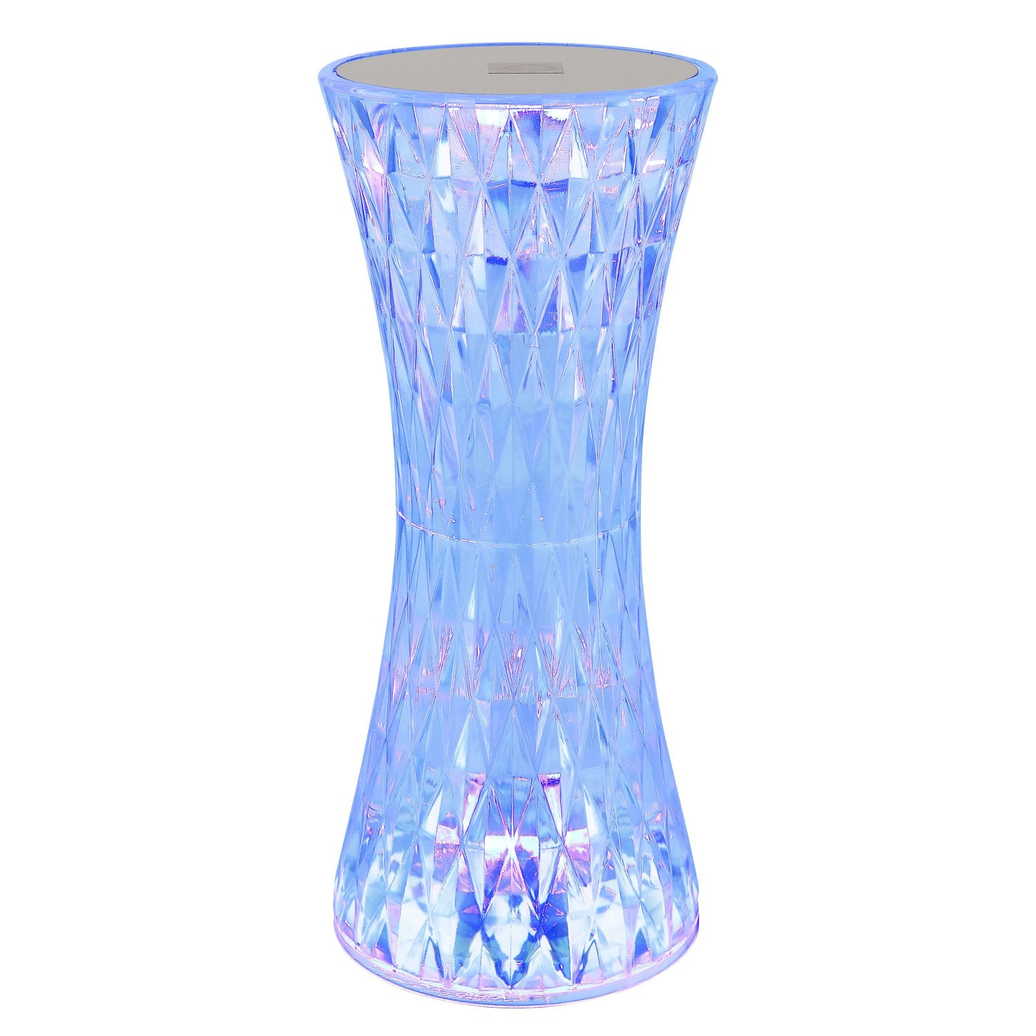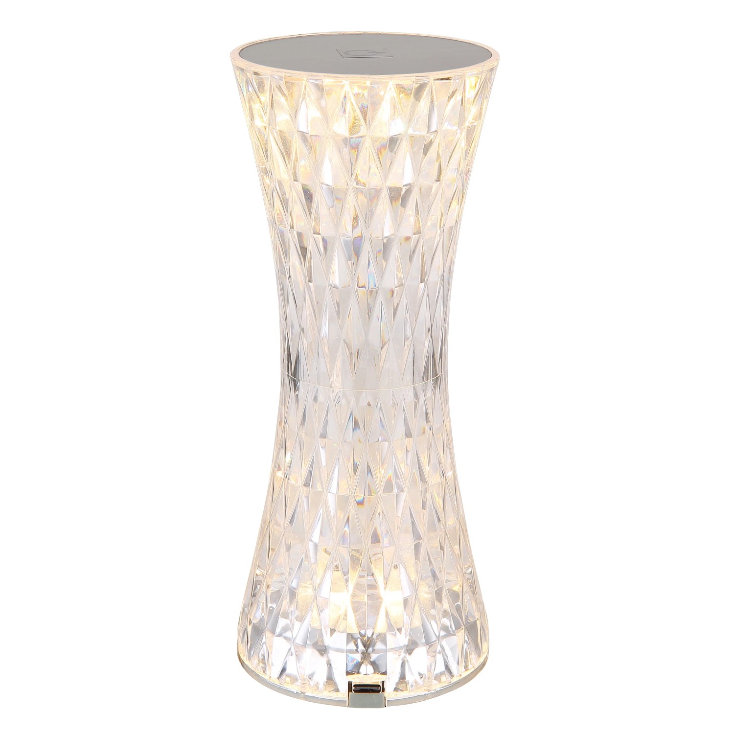 Asztali lámpa műanyag átlátszó kristály hatású, fém ezüst, kábel PVC fehér, érintés be/ki, RGB színváltó, RGB színek fixálhatók, USB, egyéb funkciók: RGB színek érintéssel válthatók, akkuval, 800mAh 3,7V , : 80mm, M:185mm, , RGBW LED-del 1,5W 5V.