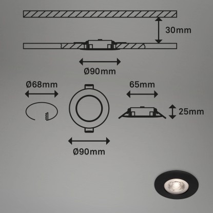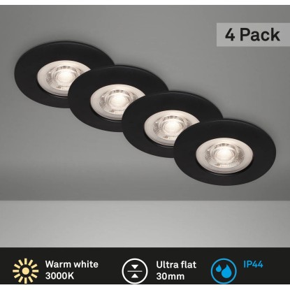 A 4 darabos fekete 4,9 W Brilo Kulana LED-es süllyesztett lámpa 480 lumen fényteljesítményű, és fixen beépített LED-táblával rendelkezik. A lámpa melegfehér fényszínnel rendelkezik. IP44 védettségi osztályú, fröccsenő víz elleni védelemmel rendelkezik, ezért fürdőszobákba is alkalmas. A süllyesztett lámpa praktikus négy darabos szettben kapható. A beszerelési átmérője 68 mm a beszerelési magasság pedig 30 mm.