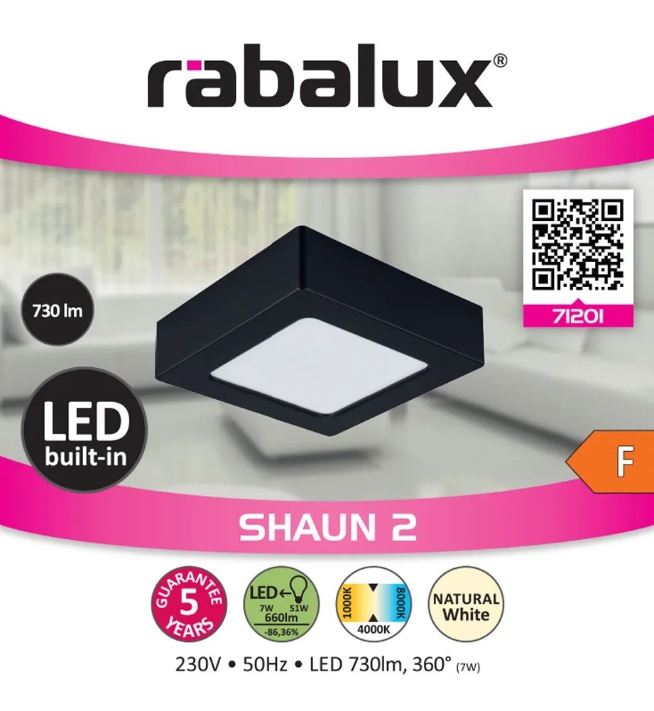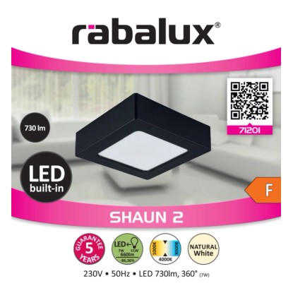 A minimál stílusú, ráépíthető Shaun 2 mennyezeti lámpát elsősorban a nappaliba, az étkezőbe, a konyhába vagy a dolgozószobába ajánljuk. A szögletes modell teljes egészében műanyagból készül, a fekete lámpatestet fehér búra egészíti ki. Letisztult megjelenésének köszönhetően ez a lámpa praktikus választás lehet szinte bármely modern otthon berendezésébe. A Shaun 2 az F energiaosztályba tartozó, beépített LED fényforrással rendelkezik, amelynek teljesítménye 7 W, fényereje búrával 660 lumen, búra nélkül 730 lumen. A 4000 K színhőmérsékletű fényforrás élettartama 20 000 óra. A természetes fehér fénnyel világító Shaun 2 segítségével modern, tiszta hatást érhetünk el, ami nemcsak a lakás nagy forgalmú helyiségeiben, de munkavégzéshez is ideális. Kis méretének köszönhetően ebből a modellből tetszés szerint többet is felszerelhetünk a szobában. A négyszögletes mennyezeti lámpa mérete 120x120 mm, mennyezettől mért távolsága pedig mindössze 33 mm.