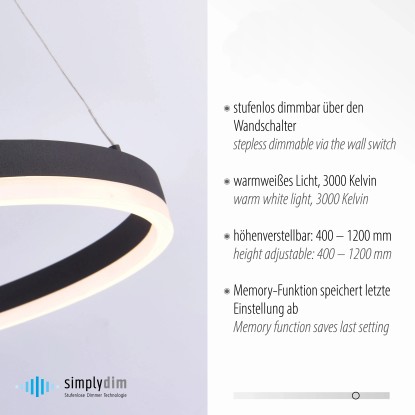 A Paul Neuhaus antracit színű Titus LED-es függőlámpája egyszerű, modern kialakításával nyűgöz le. Az izzó színhőmérséklete 3000 Kelvin, kellemes melegfehér fényt biztosít, emellett rendkívül otthonos és hangulatos. A lámpa fokozatmentes simply dim fényerőszabályozó technológiával rendelkezik. A Simply dim funkció lehetővé teszi, hogy a lámpa fényerősségét egy villanykapcsolóval szabályozhassa, legyen szó billenő-, húzó-, zsinór- vagy fali kapcsolóról. A fényerőszabályozó technológia a kapcsolási impulzuson keresztül szabályozza a világosságot, így a függőlámpa fényereje fokozatmentesen szabályozható 100%-ról 10%-ra. Ha a lámpát a kikapcsolás után 3 másodpercen belül újra bekapcsolja, akkor megkezdődik a fényerő-szabályozó folyamat. Ha eléri a legvilágosabb (100%) vagy a legsötétebb (10%) értéket, a művelet újbóli elindításához kb. 2 másodpercig megáll ezen a beállításon. Ha a lámpa egy művelet során a kívánt fényerősségben világít, akkor a lámpa kikapcsolásával elmentheti a fényintenzitást. Ha újra bekapcsolja a lámpát, a lámpa a tárolt fényerővel világít, és a beállítás megmarad. A függőlámpa egyszerű kezelése biztosítja, hogy a lámpa gyorsan megtalálja a megfelelő alkalmazási helyet. A beépített Reutlinger zár segítségével a lámpa felfüggesztése a helyiség adottságaihoz igazítható.