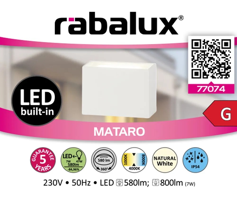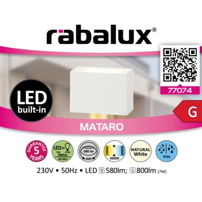 A modern stílusú Mataro kültéri fali lámpát elsősorban a teraszra vagy a ház külső falára ajánljuk. Ez a fehér színű modell bizonyosan el fogja nyerni a tetszését, ha azokat a kültéri lámpákat részesíti előnyben, amelyek letisztult, egyszerű dizájnjukkal szinte észrevétlenül simulnak bele a környezetükbe. A téglatestet formázó Mataro alumíniumból, fehér üvegbúrával készül, és a G energiaosztályba tartozó beépített LED fényforrással rendelkezik. A fényforrás teljesítménye 7 W, fényereje búrával 580 lumen, búra nélkül 800 lumen, színhőmérséklete pedig 4000 K. A természetes fehér fénnyel világító fényforrás élettartama 25 000 óra. A kültéri lámpa méretei a következők: szélessége 90 mm, magassága 65 mm, faltól mért távolsága 65 mm. A lámpa IP54-es védettséggel rendelkezik, ami garantálja, hogy ez a modell por ellen, valamint bármilyen irányból fröccsenő víz ellen védett. Az ideális működési hőmérsékleti tartománya -20-40 °C.