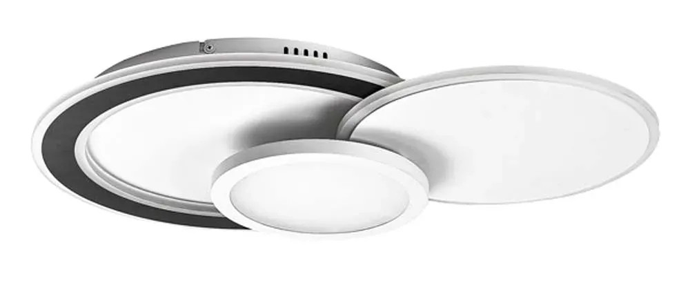 A Rábalux Stavros mennyezeti lámpát azoknak ajánljuk, akik számára az okos funkciók mellett a kreatív formatervezés is fontos. A LED lámpa fémből, fekete színben, fehér műanyag búrával készül, és három eltérő méretű, kerek, egymást részlegesen fedő lámpaelemből áll. Beépített LED fényforrást tartalmaz, ami energiahatékony működést és hosszú élettartamot garantál. A lámpa színhőmérséklete távirányítóval vagy fali kapcsolóval állítható. Továbbá rendelkezésünkre áll RGB világítás, ami a középső, legkisebb lámpaelem felületén érvényesül. A mennyezeti lámpa fényereje ugyancsak állítható, ezenkívül memória funkció is elérhető - mindkettő távirányítóval kezelhető. A lámpa fényereje elegendő egy tágasabb szoba bevilágítására. Ideális választás a nappaliba, étkezőbe vagy hálószobába.