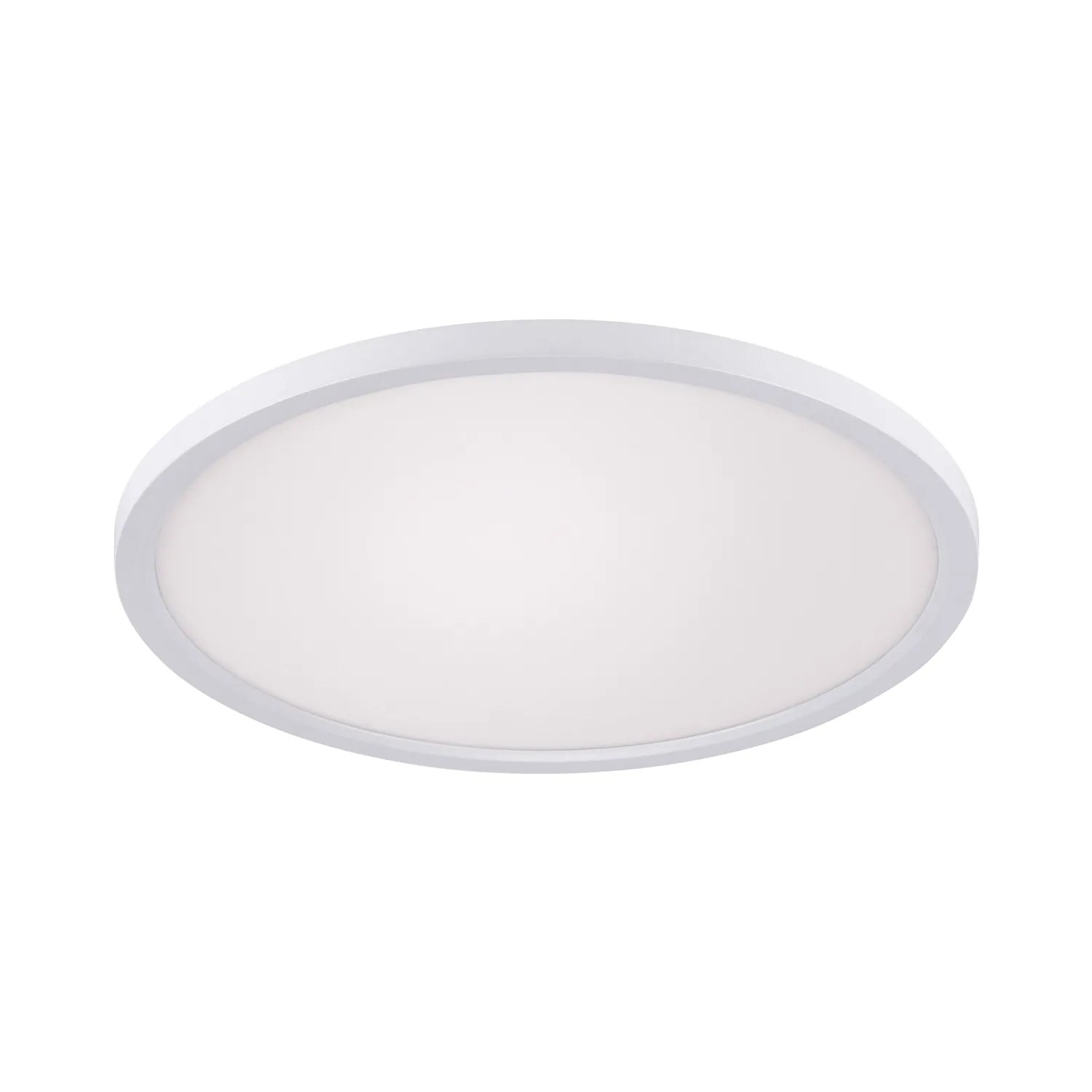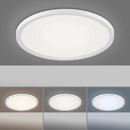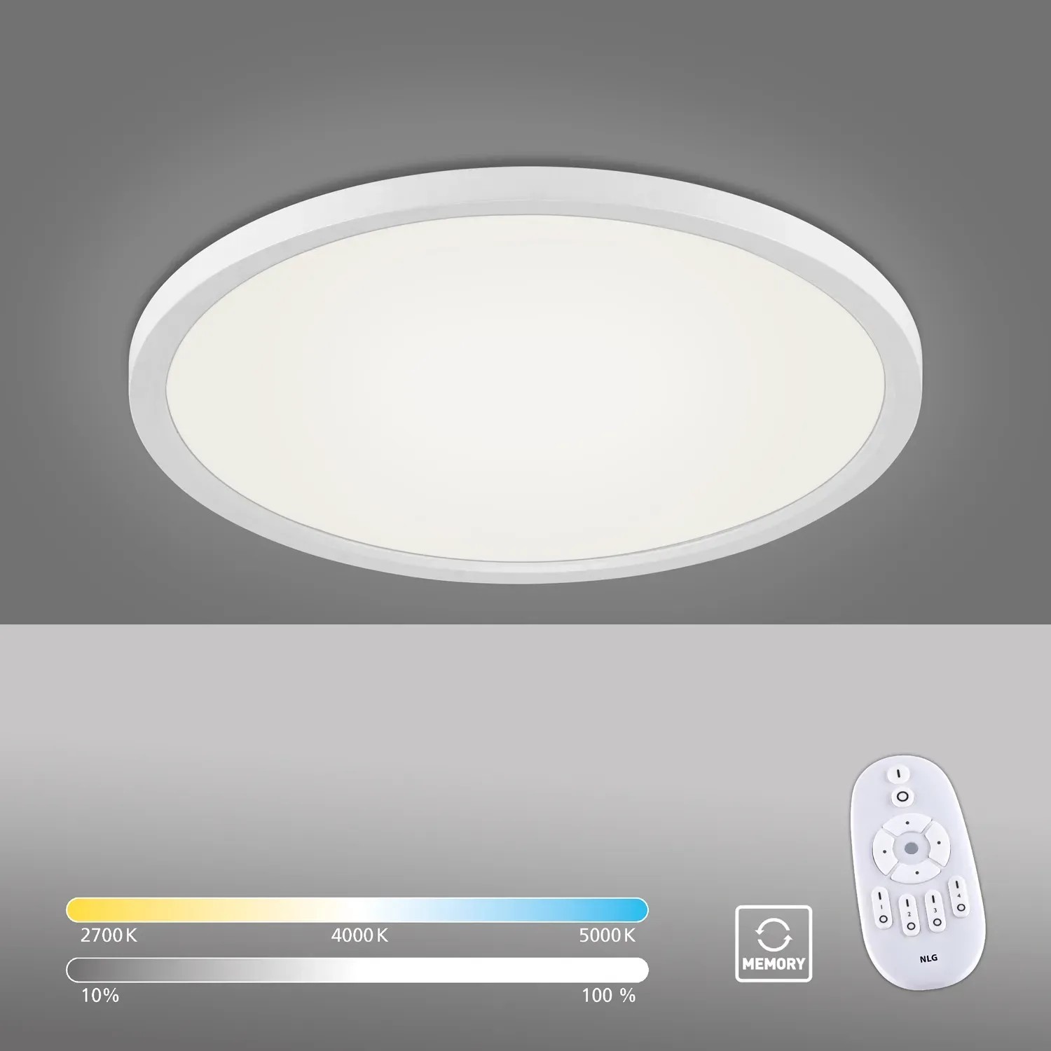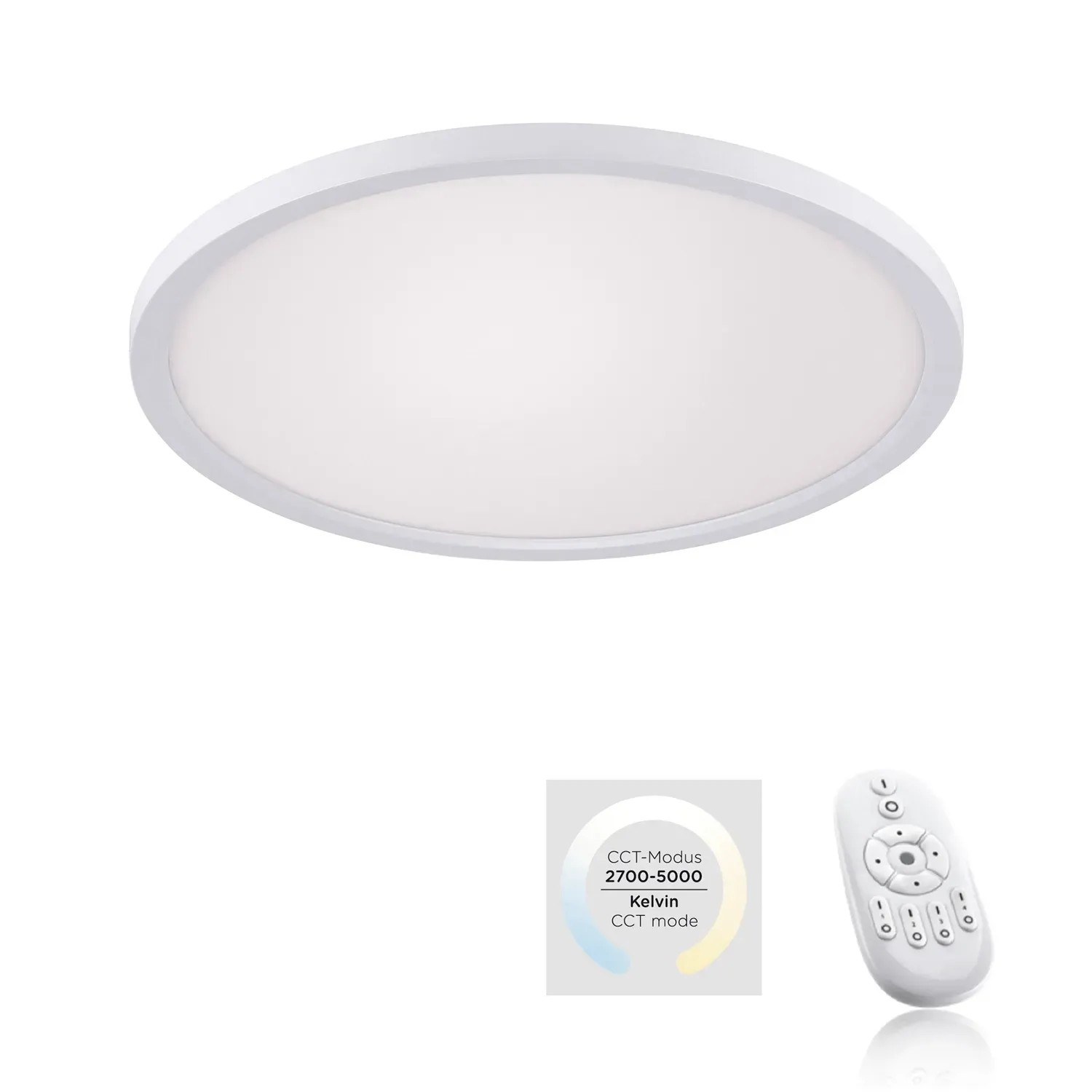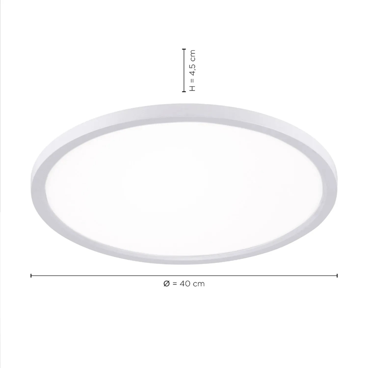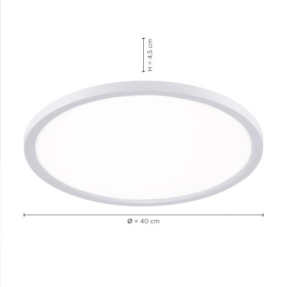 A kerek LED-es mennyezeti lámpa ultralapos kialakításával győz meg, ezért sokoldalúan használható. A különösen helytakarékos fényforrás fehér színű acélkerettel van ellátva, a fehér műanyag üveg pedig kellemes fényt biztosít. A mennyezeti lámpát 20,0 wattos LED izzóval szállítjuk. Az izzó mintegy 2500 lumen fényerőt bocsát ki, és a fény színe a melegfehértől (2700 Kelvin) a nappali fehérig (5000 Kelvin), valamint a fényerősség beállítására is lehetőség van. Ez a szabályozás a rádiós távirányítóval történik, amely a lámpatest tartozéka. Vizuálisan a mennyezeti lámpatest kétségtelenül a háttérben marad, de egyszerű megjelenése miatt különösen konyhákban, folyosókon vagy tanulószobákban használható, ahol jó megvilágítást biztosít. De a mennyezeti lámpát nemcsak ott, hanem a nappaliban és a hálószobában is használják. A lámpa átmérője 40,0 cm, felfüggesztése pedig 4,5 cm.