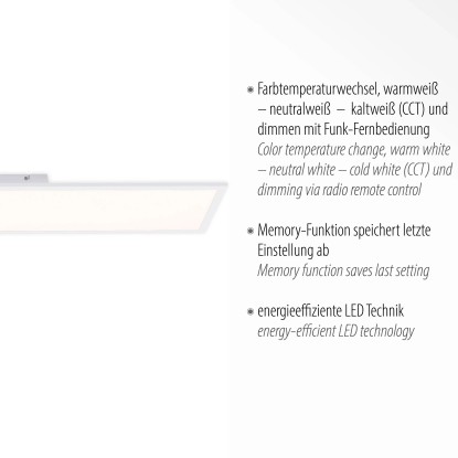 5 cm-es magasságával a panel különösen vékony, és kikapcsolt állapotban alig észrevehető. A mennyezeti lámpa acélelemekből és fehér műanyag üvegből áll, amely kellemes és vakításmentes fényt ad.Váltás a színhőmérsékletek között távirányítóval