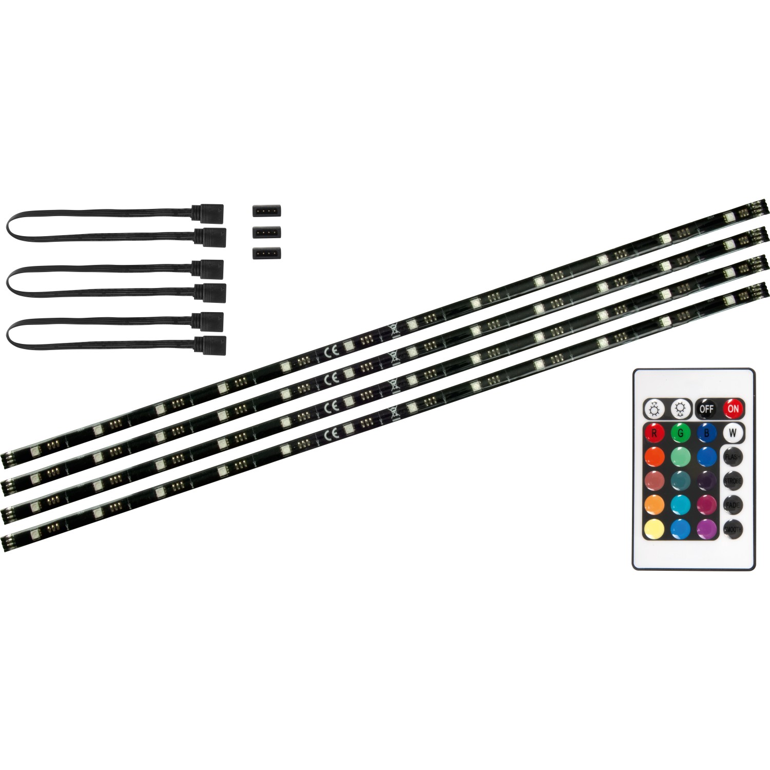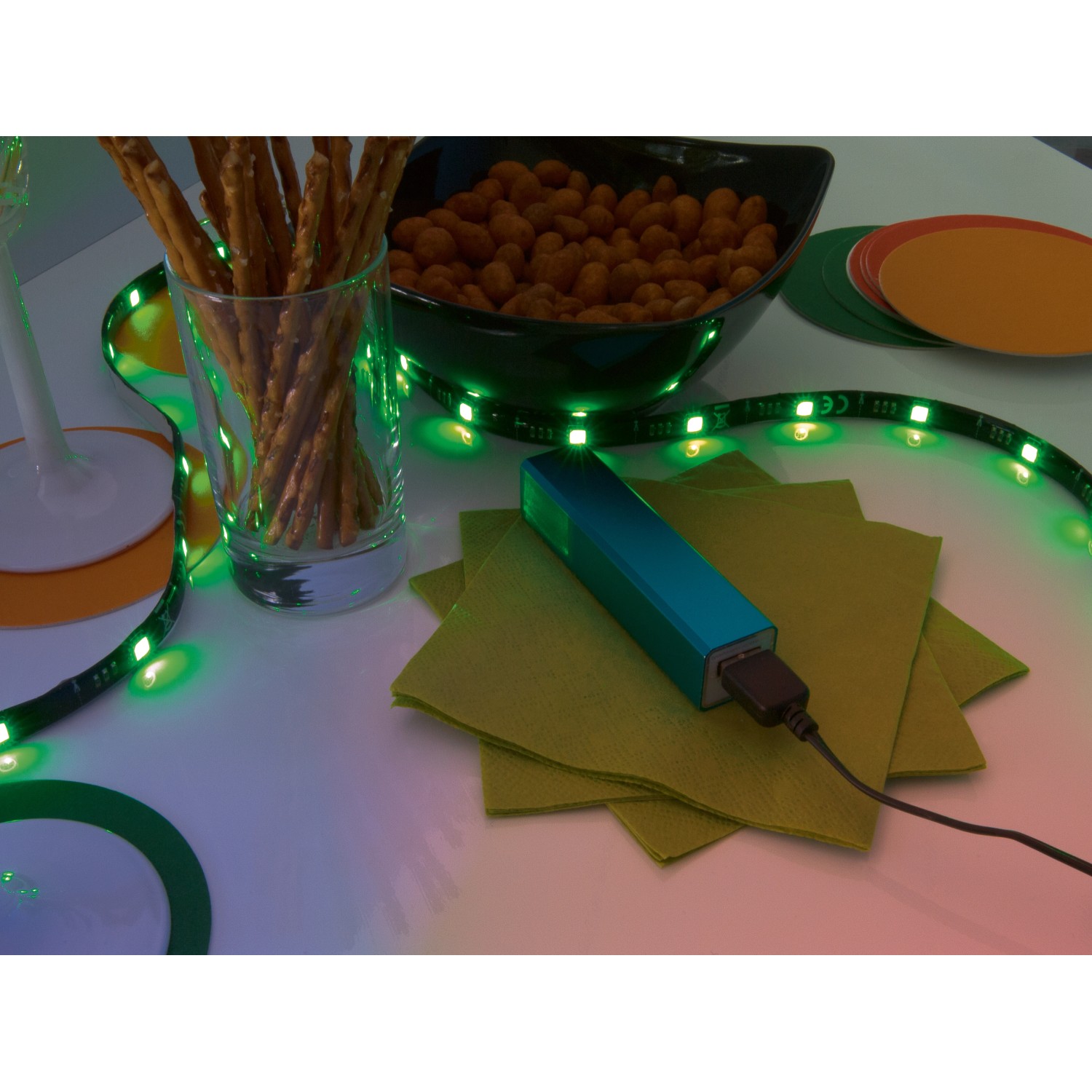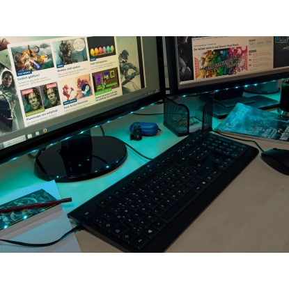 Az OBI Lighting rugalmas LED-szalag kiválóan alkalmas dekoratív célokra és közvetett megvilágításra. Bútorokra vagy egyéb fix berendezési elemekre ragasztható, és vonzza a tekintetet otthonában. Az egyes darabokat egyszerűen csak össze kell illeszteni, és máris felhelyezhető a kívánt helyre. Összekötő elem vagy összekötő kábel segítségével rövid távolságok is áthidalhatók. A 4 db 50 cm hosszú szalag mindegyike 12 darab fix LED-del rendelkezik, és műanyagból készültek. A fényt hangulatának megfelelően állíthatja be. Négy színváltó mód, 16 különböző szín, valamint a fényerőt tompító funkció közül választhat. Az IP20 védelmi osztálynak megfelelően védelmet nyújt az ujjakkal való érintés esetén. Beltéri használatra alkalmas. Teljesítménye 1,5 W. A kényelmes használat érdekében a rugalmas szalag távirányítóval vezérelhető. A szükséges 3 voltos elem külön kapható. Az áramellátáshoz a csatlakoztatás USB-csatlakozóval történik, amelyet a csomag tartalmaz.