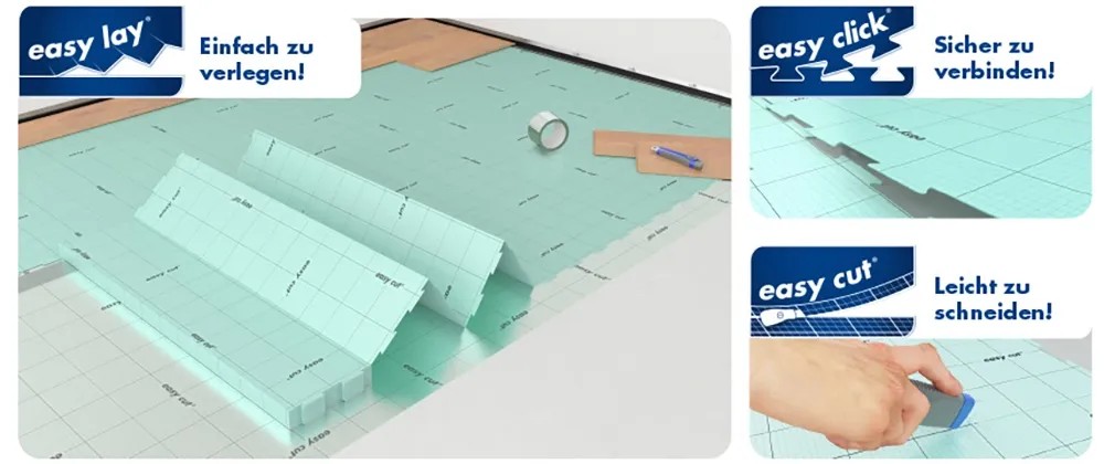 Az egyszerű lerakási segédeszközöknek köszönhetően a szigetelőfólia könnyen lerakható. Az easy lay rendszernek köszönhetően a lépéshang-szigetelés gyorsan lerakható. A beépített ragasztószalaggal ellátott átfedő szalag megakadályozza az egyes lapok elcsúszását, a lapok átfedését vagy a levegős rétegek kialakulását. A fóliára erősített easy cut raszterezés pontos vágást tesz lehetővé.Blauer Engel (Kék Angyal) jelölés