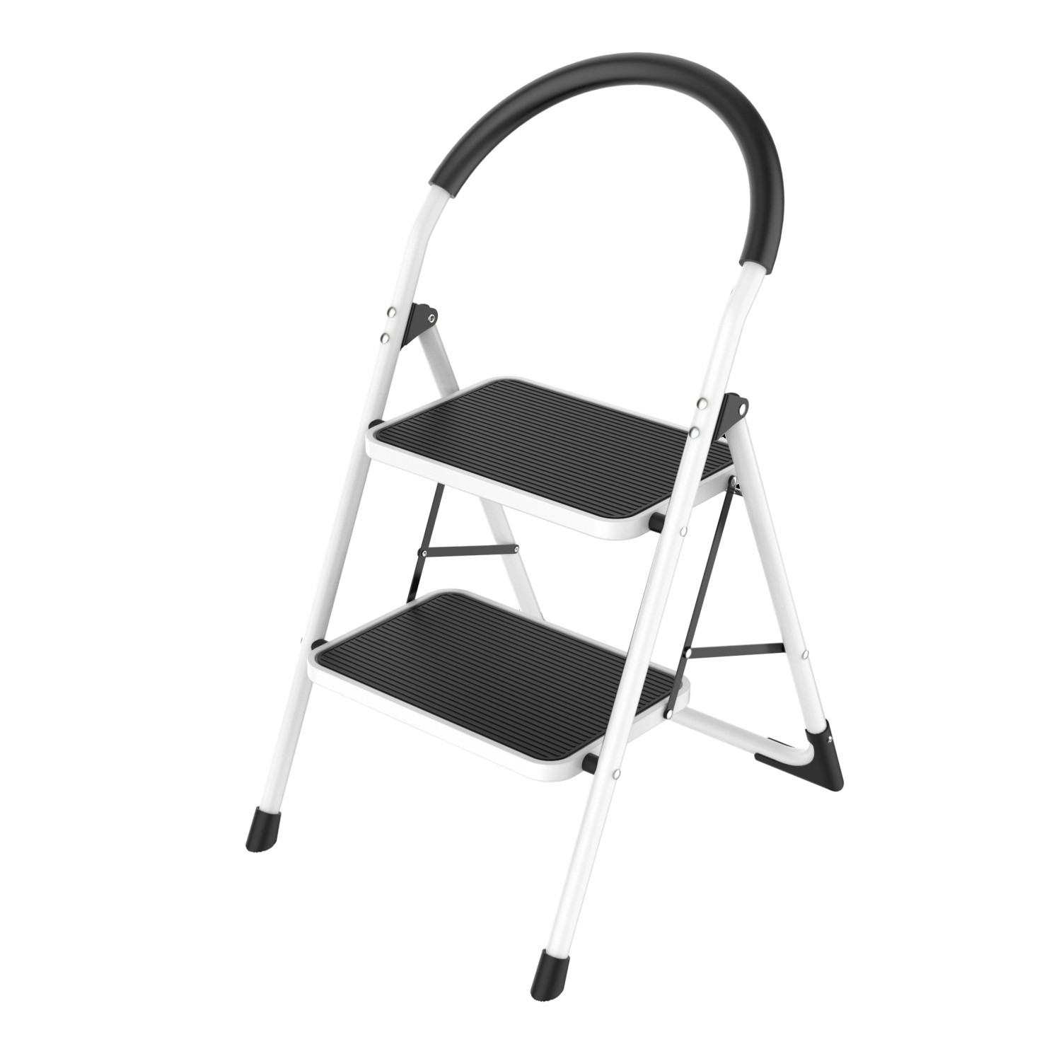 A létra két lépcsőfokkal van beállítva. Kiváló minőségű acélból készült, a lábakat acél csapszegek rögzítik. A megerősített csuklóval ellátott biztonsági reteszelésű lehajtás elleni védelem akár 150 kg-os terhelést is lehetővé tesz.