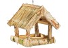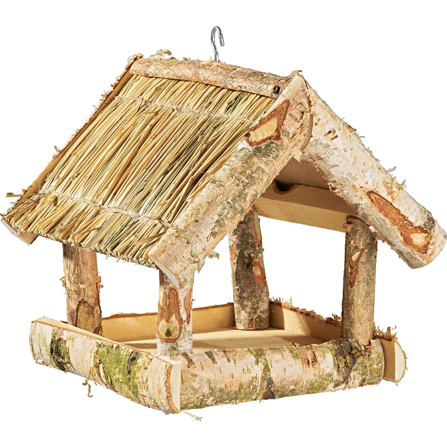A szalmatetős madáretető ház nyírfából készült. A kampó segítségével a madárház kényelmesen felakasztható.