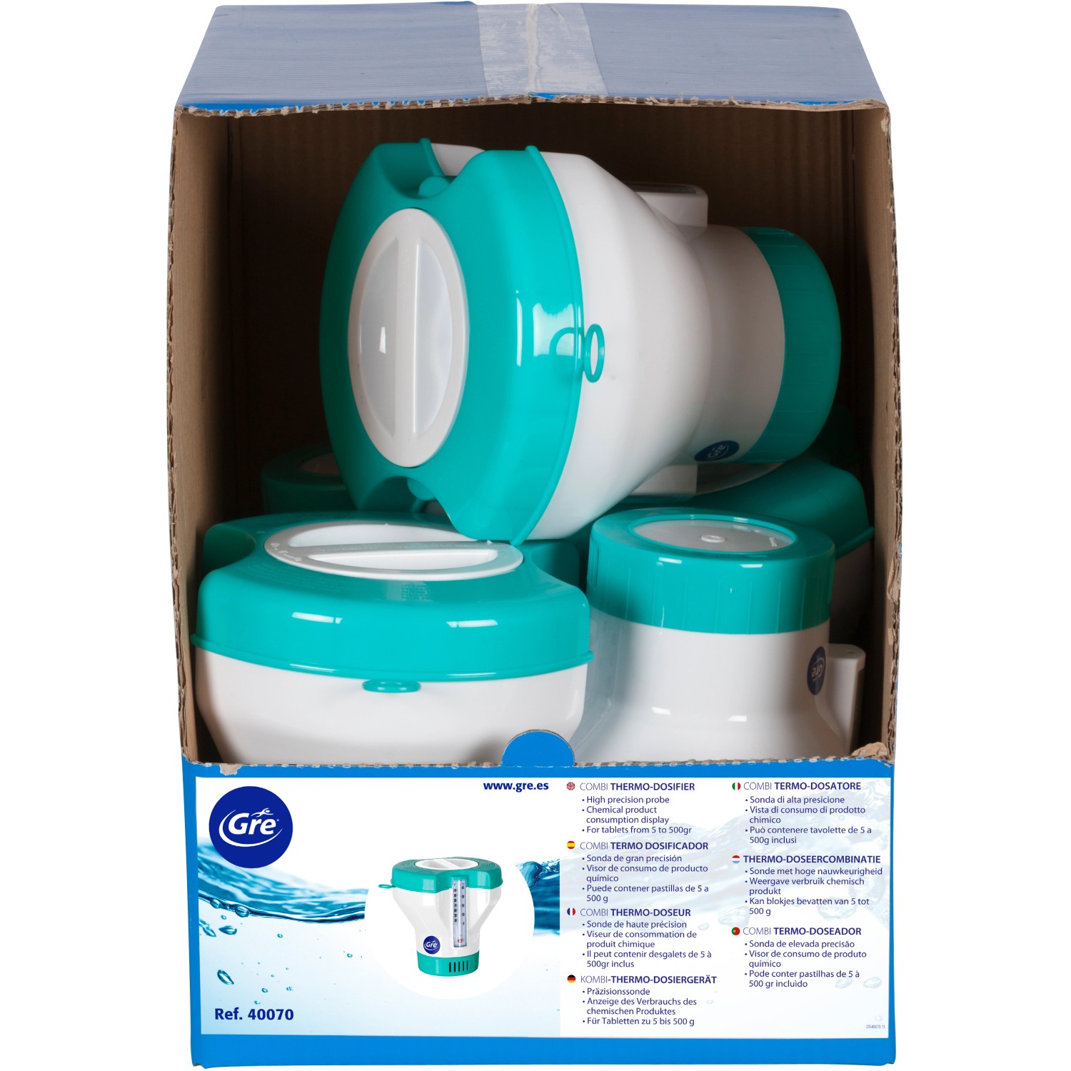 A Gre Combi hőmérő és adagoló kettős funkciót lát el: Hőmérő és adagoló klórtablettákhoz. Az adagoló fogyasztásjelzővel rendelkezik. A vízhőmérséklet °C és °F értékben is megjelenik. ABS műanyagból készült, és 1,5 kg klórtabletta befogadására alkalmas.