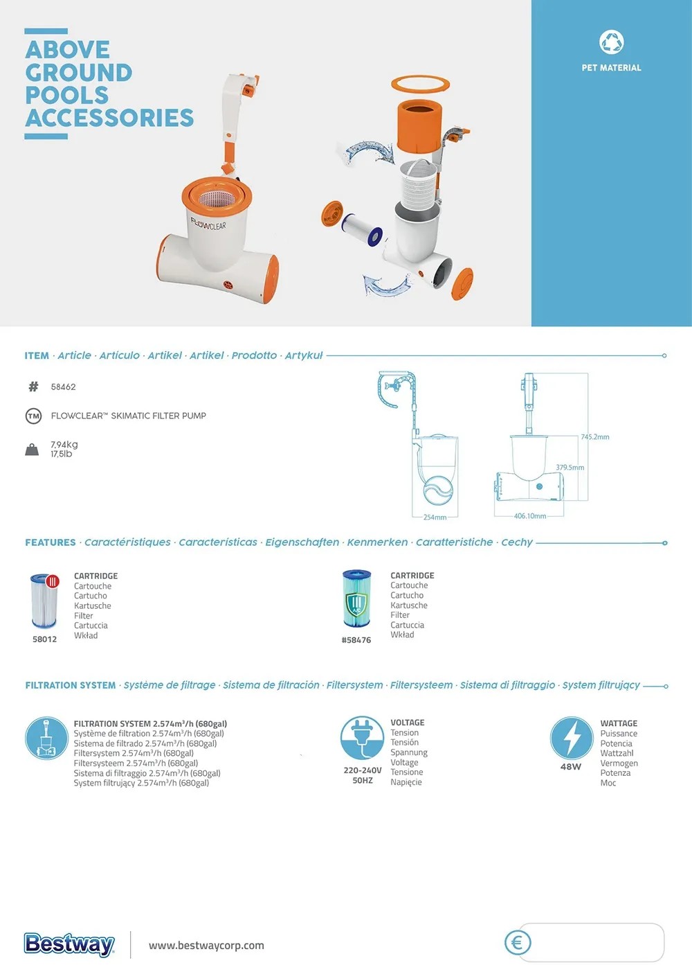 A Bestway Flowclear Skimatic 2 az 1-ben felfüggeszthető szűrőjével tiszta víz garantálható a medencében. A speciálisan erre tervezett szűrőszivattyúk eltávolítják a bosszantó szennyeződéseket és lerakódásokat, hogy a medence vize mindig kristálytiszta maradjon. A szűrőszivattyú-kombináció 2574 l vizet tud egy óra alatt keringetni. A vízfelület csendes tisztítása, valamint a medence vizének szűrése teszi ezt a szűrőt ennyire kényelmessé.