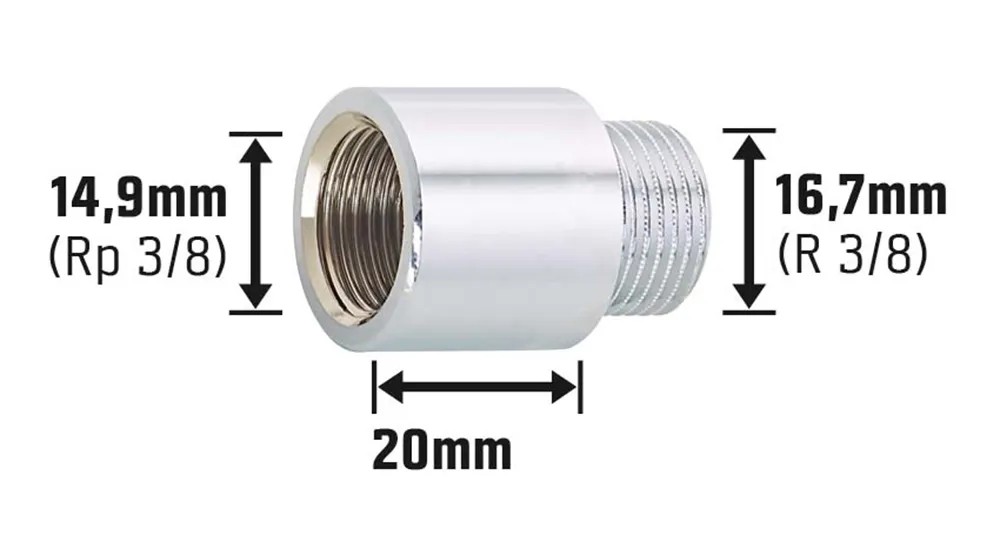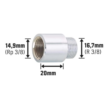 A megbízható OBI csaphosszabbító egy menetes szerelvény, amely a hideg- és meleg vizes vezetékek fektetésekor, valamint a fűtés szerelésekor használatos. Sokoldalúan használható, például csaptelepek csatlakozóinak hosszabbításához. A felhelyezést a 14,9 mm-es (Rp 3/8) belső menet és a 16,7 mm-es (R 3/8) külső menet segíti. A hosszabbítás mértéke 20 mm.