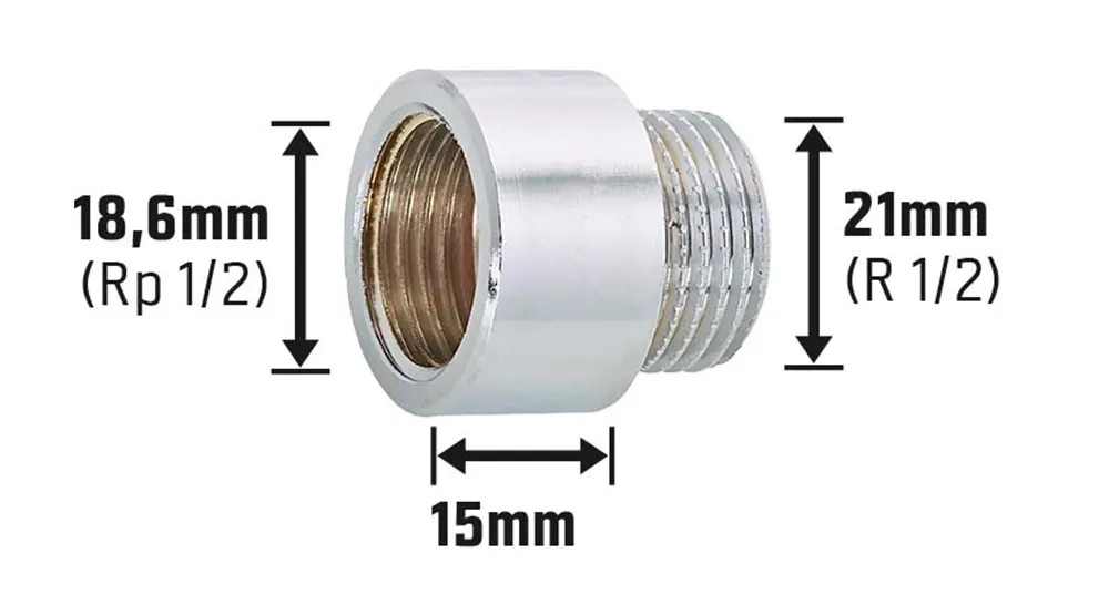 Az OBI csaphosszabbító egy sokoldalúan használható, pontosan illeszthető menetes szerelvény hideg- és meleg vizes vezetékekhez, valamint fűtéscsövekhez. Egyszerűen meghosszabbítja például a csaptelepek csatlakozásait. A két csavarmenet, a belső és a külső menet méretei: 18,6 mm (Rp 1/2) és 21 mm (R 1/2). A hosszabbító darab mérete 15 mm.