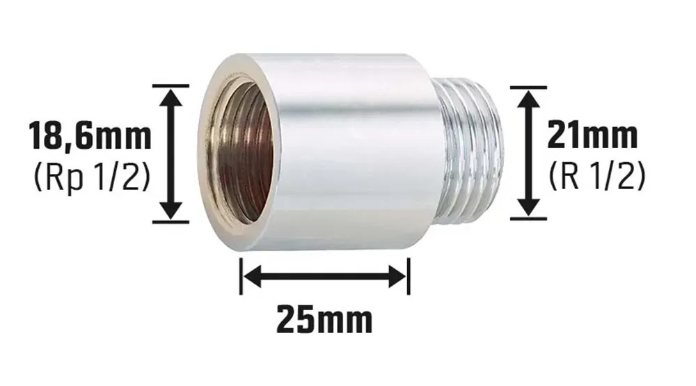 A sokoldalú OBI csaphosszabbító egy menetes szerelvény, amely a hideg- és meleg vizes vezetékek fektetésekor, valamint a fűtés szerelésekor használatos. Például a csaptelepek csatlakozóinak egyszerű hosszabbítását teszi lehetővé. A két csavarmenet, a belső és a külső menet méretei: 18,6 mm (Rp 1/2) és 21 mm (R 1/2). A csatlakozás 25 mm-rel lesz hosszabb.