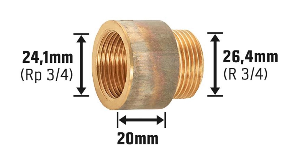 A hasznos és megbízható OBI csaphosszabbító a hideg és meleg vizes vezetékek fektetésekor, valamint a fűtés szerelésekor használatos menetes szerelvény. A csaptelep csatlakozójának hosszabbítására szolgál. A szerelvény egyik oldalán csavaros menettel rendelkezik, melynek belső menete 24,1 mm (Rp 3/4), akárcsak a másik oldalon, ahol a külső menet 26,4 mm-es (R 3/4). A hosszabbító idom mérete 20 mm.